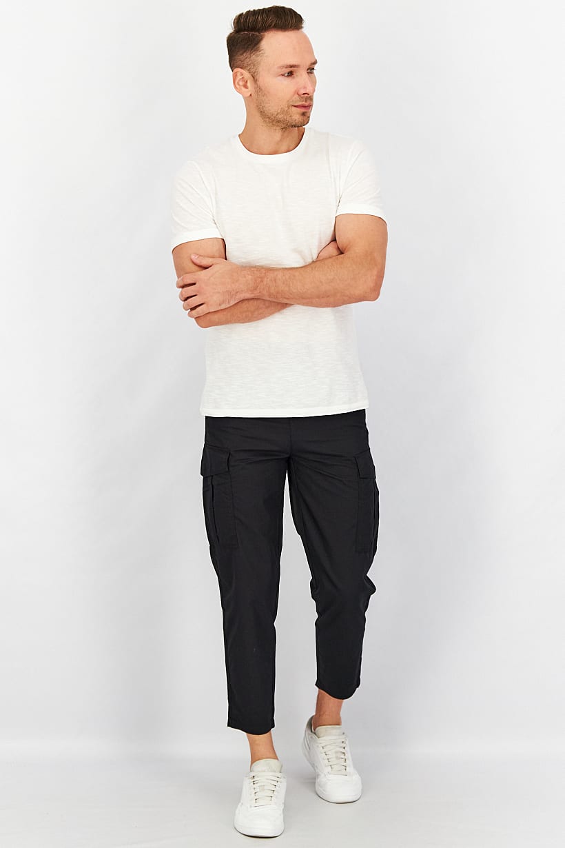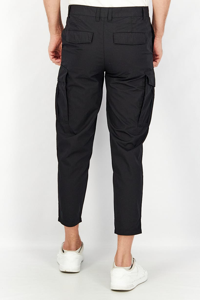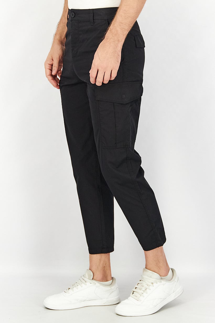 | sub_Categories | Men Clothing, Pants, men tapered fit cargo pocket belt loops textured pants black |