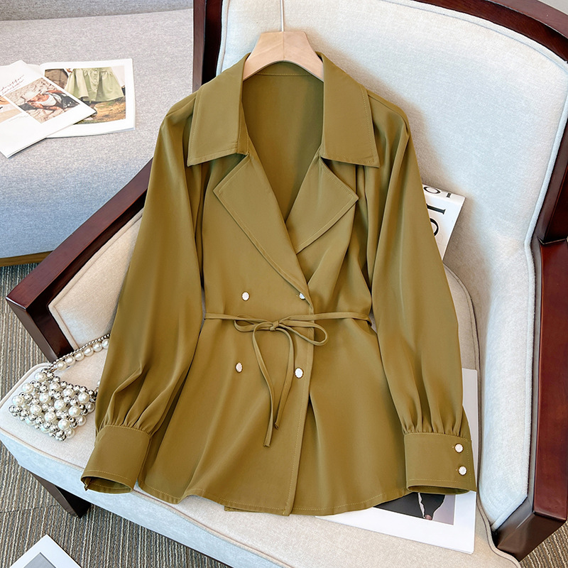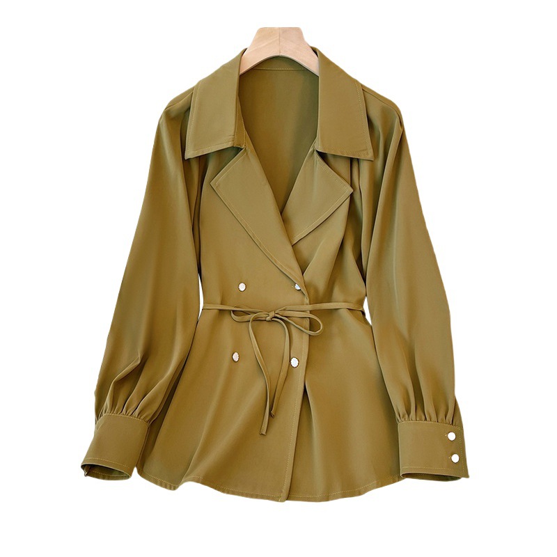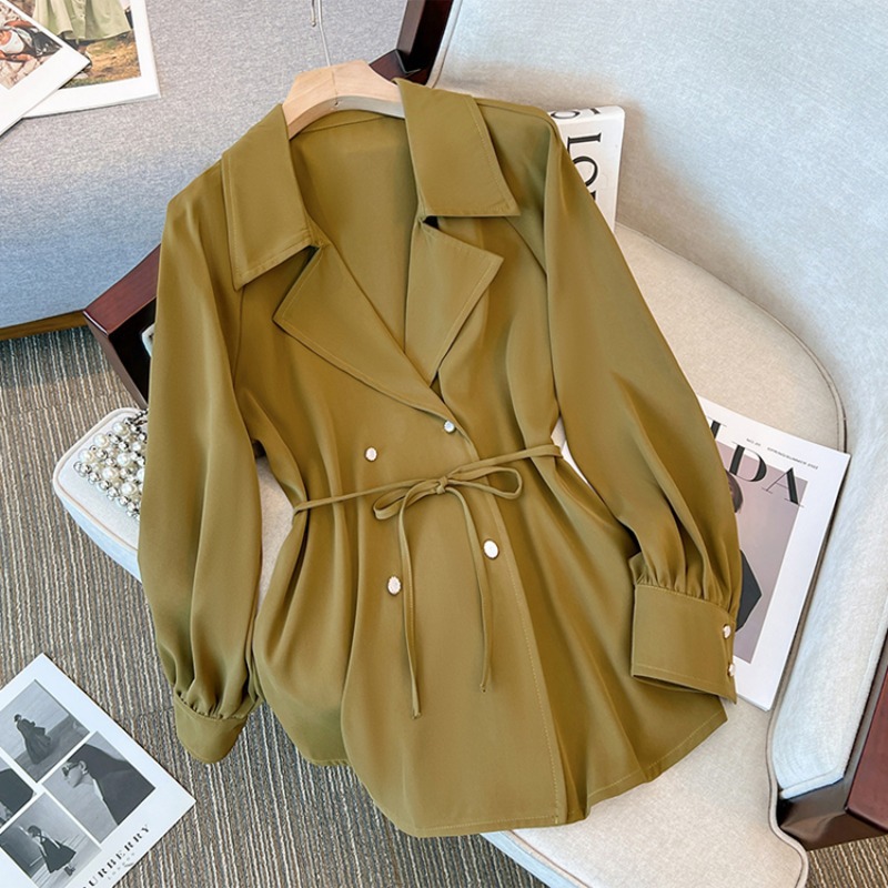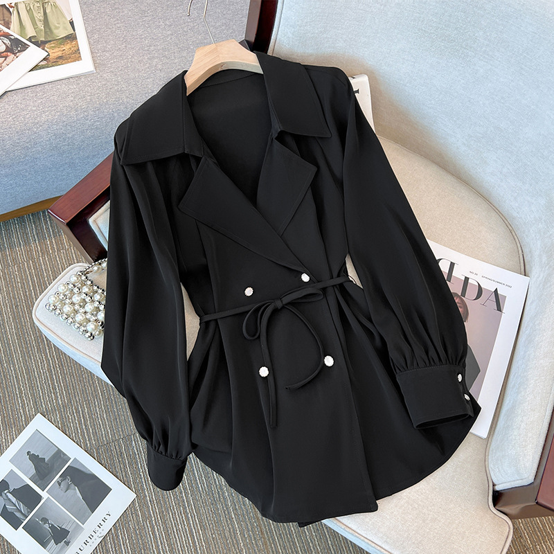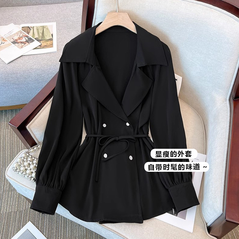 Black trench coat suit collar shirt women's early spring plus size chubby girl tight waist mid-length outer cardigan
