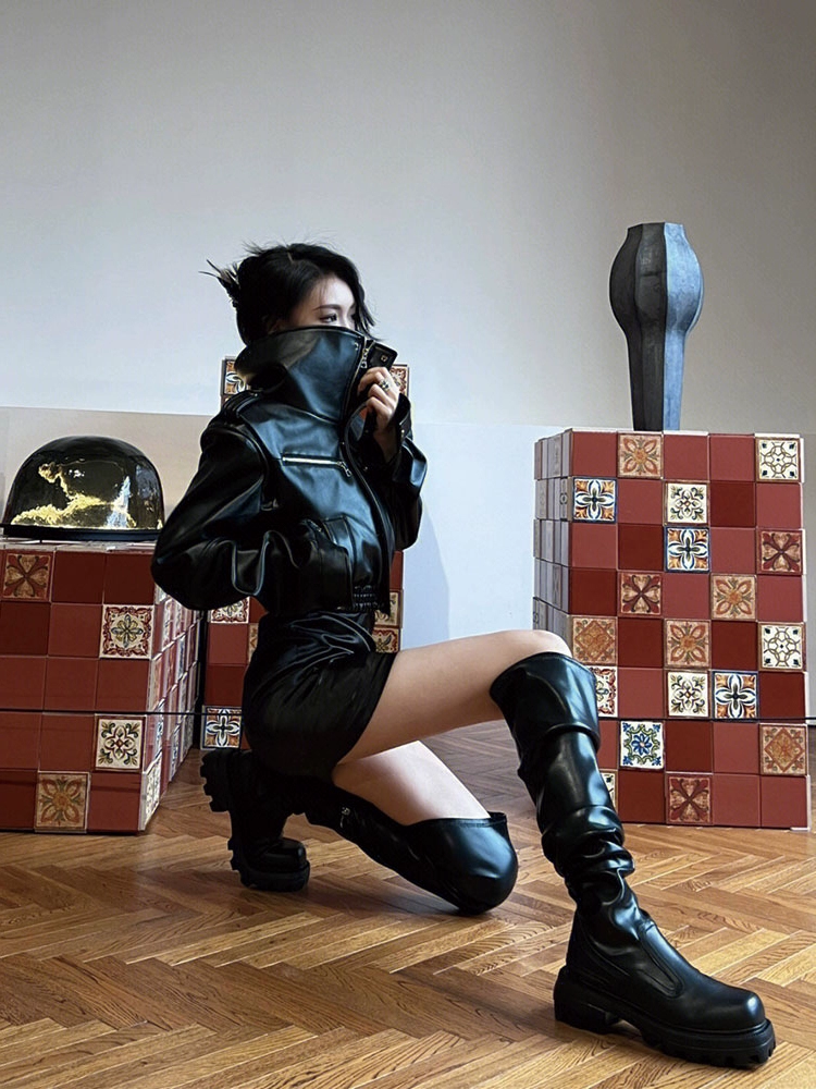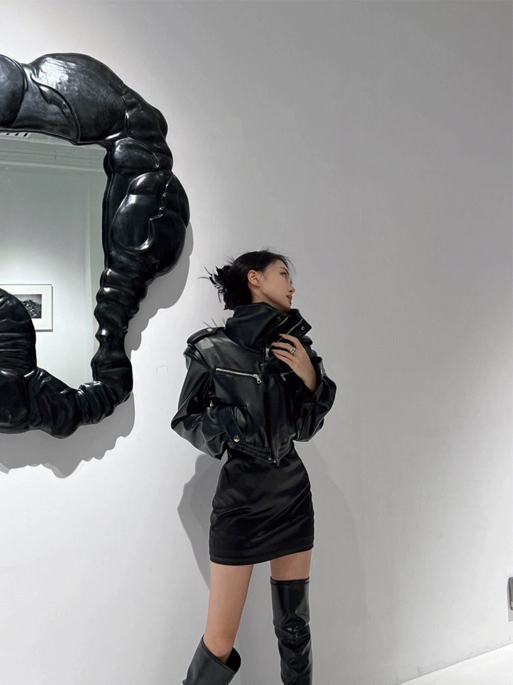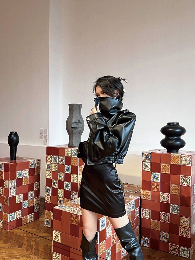 Black high -necked PU leather jacket female autumn and winter 2024 new American retro short locomotive jacket top