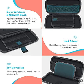 The top layer of the case features a mesh pocket that protects your accessories from scratches and prevents small items from falling out. The bottom layer is made of soft, shock-resistant material that keeps your console safe from scratches. The hook and loop design ensures that your console stays securely in place.