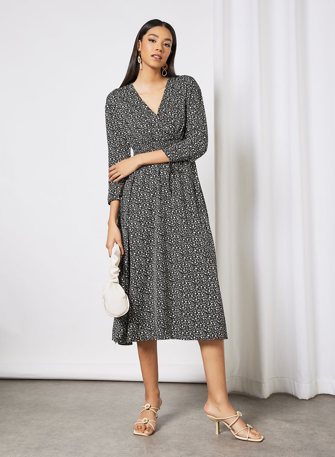 This product features a cozy and plush polyester material that feels great against the skin. It showcases a charming ditsy floral pattern throughout, with a flattering V-neckline and three-quarter sleeves. The shirred panel at the waist allows for a customizable fit, while the midi length and regular fit provide a comfortable and stylish look. Please follow the care label instructions when washing.