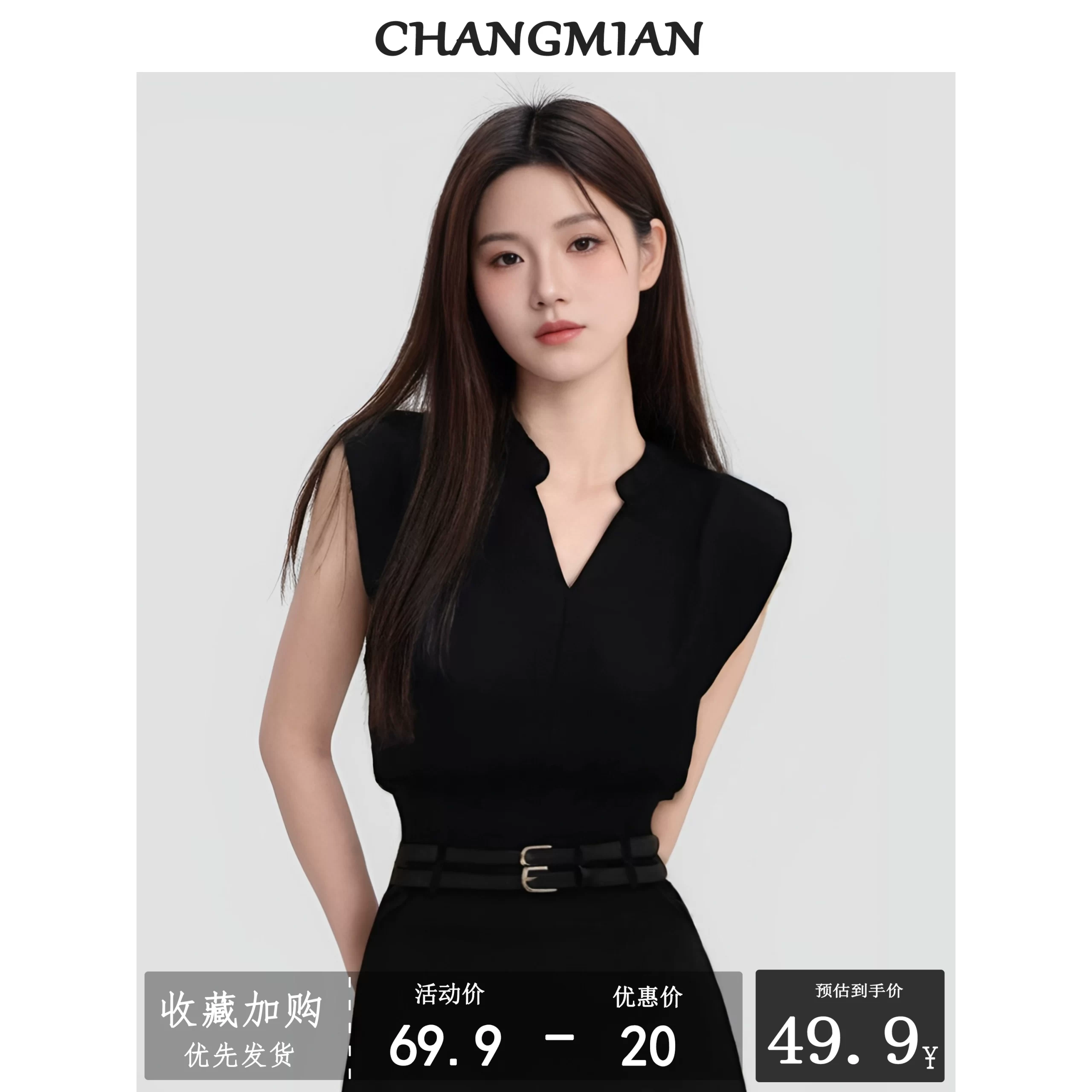 Black V-neck, straight shoulder small slim sleeveless T-shirt