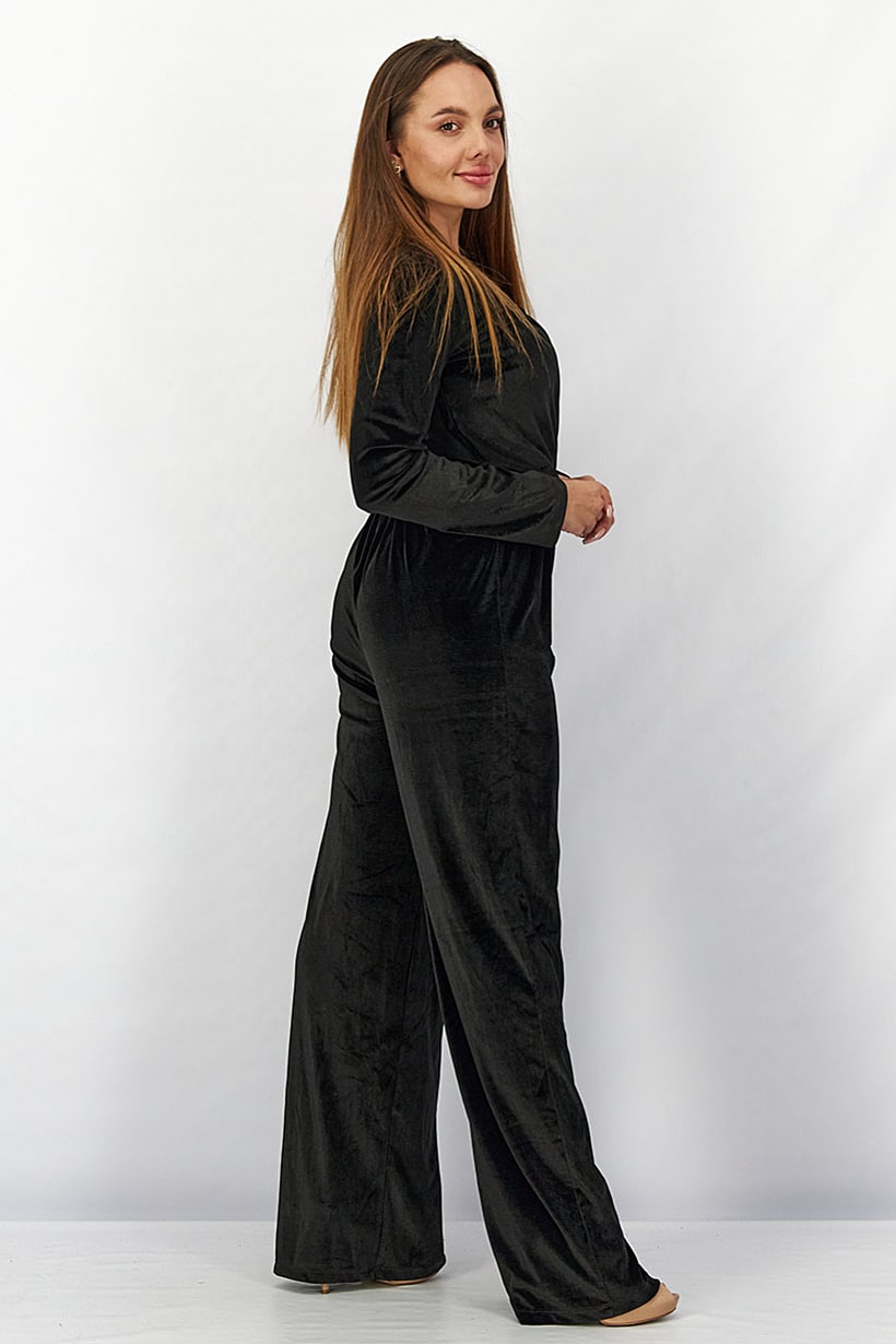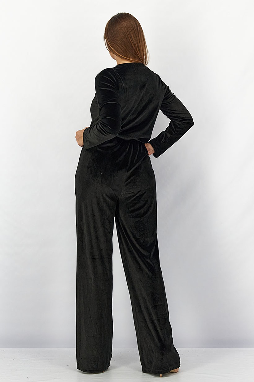 Black Velvet Wrap Jumpsuit with Long Sleeves for Women.