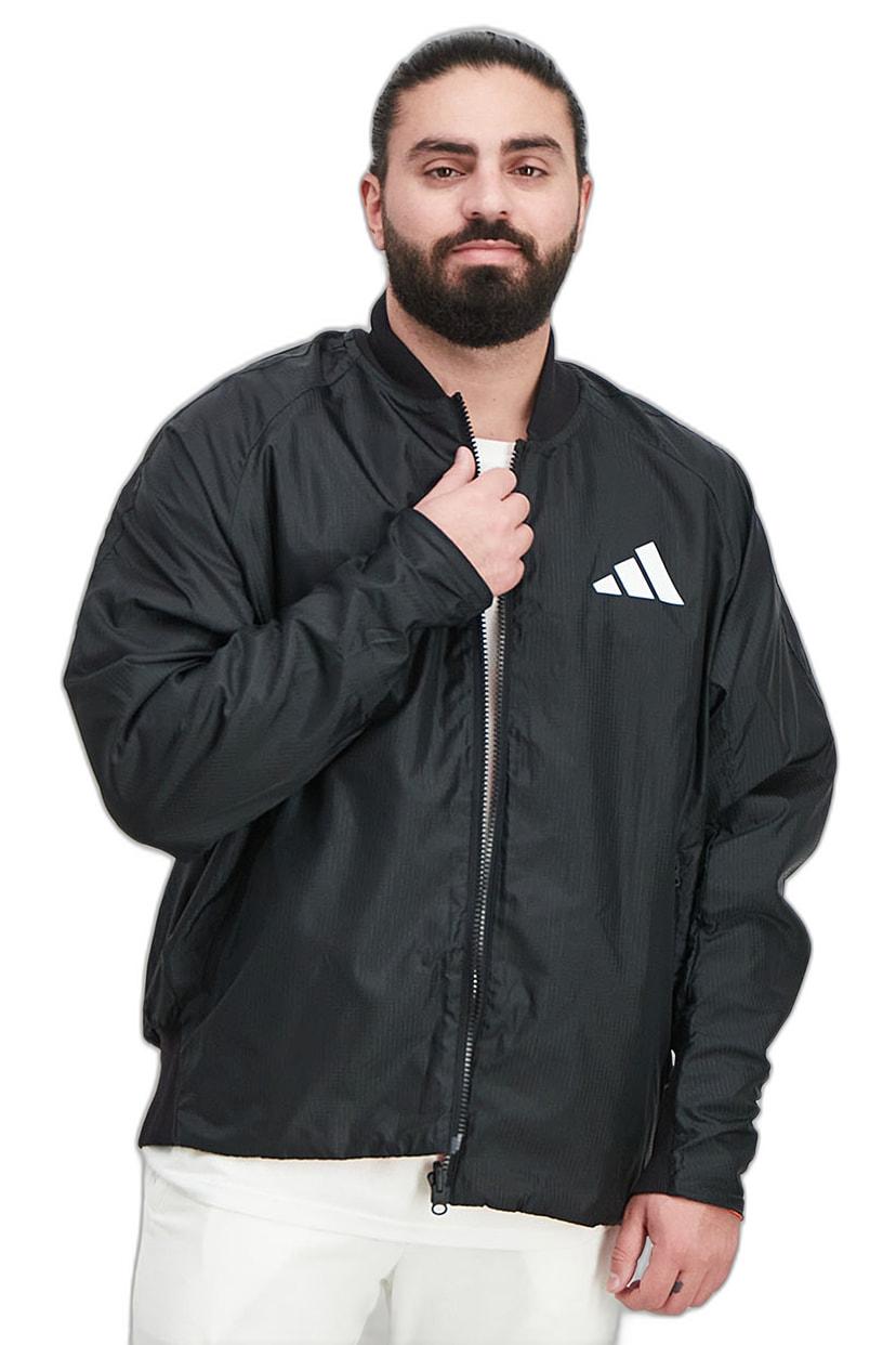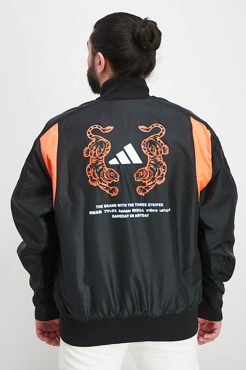This product is easy to care for as it is machine washable. The size displayed is in international sizing. It is a heavy jacket suitable for training in various sports. Please note that the color of the product may differ slightly due to lighting or monitor settings. The fabric used is 100% polyester and features a graphic print. This jacket is categorized as sportswear and is available in black. It has an oversized fit for added comfort.