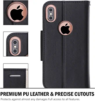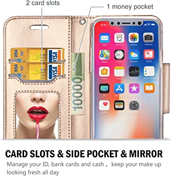 Black Wallet Case for iPhone Xs/X with Card Slots, Mirror Wristlet and Folding Stand. Protective Cover with Flip Kickstand for 5.8 inch Apple iPhone Xs (2018) / iPhone X (2017).