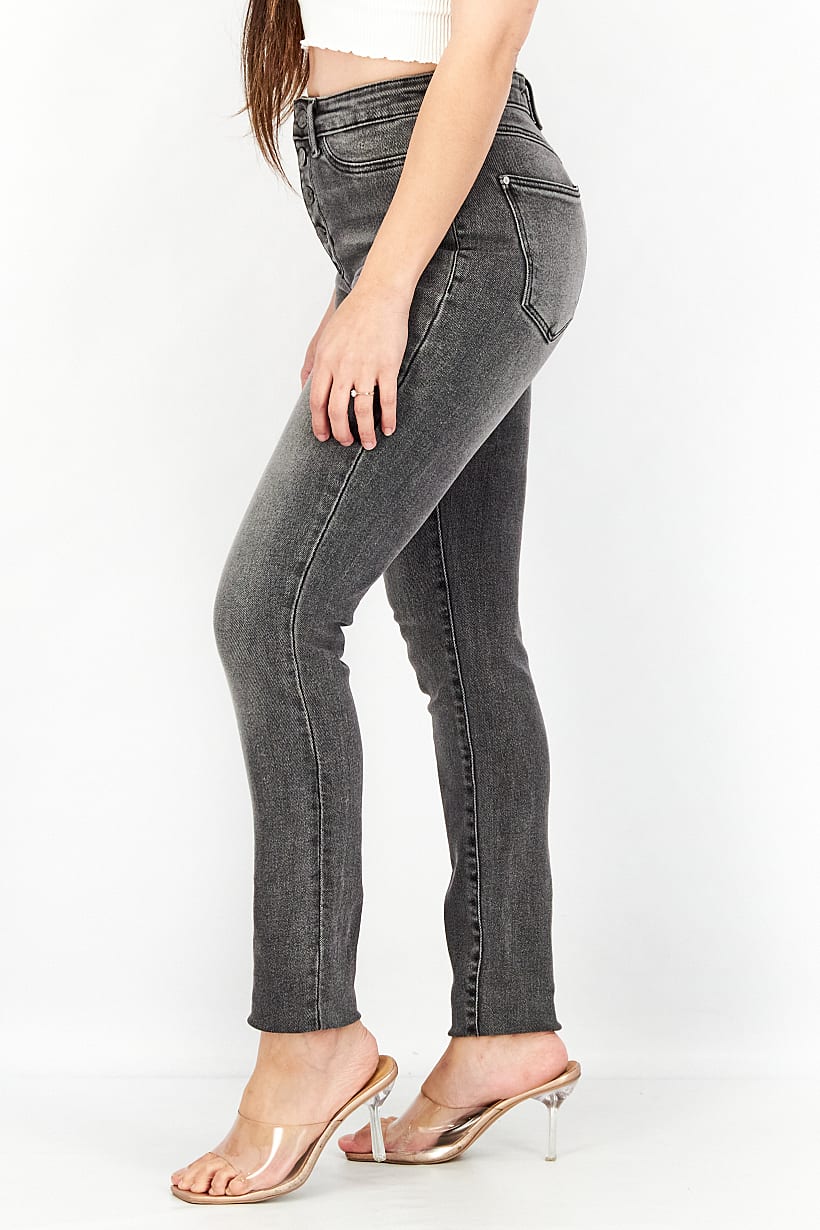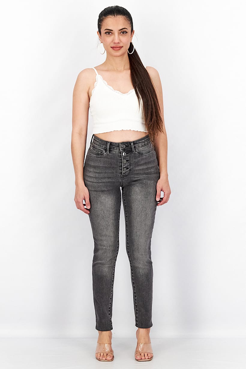 Black Wash Button Fly Skinny Jeans for Women with Stretch.