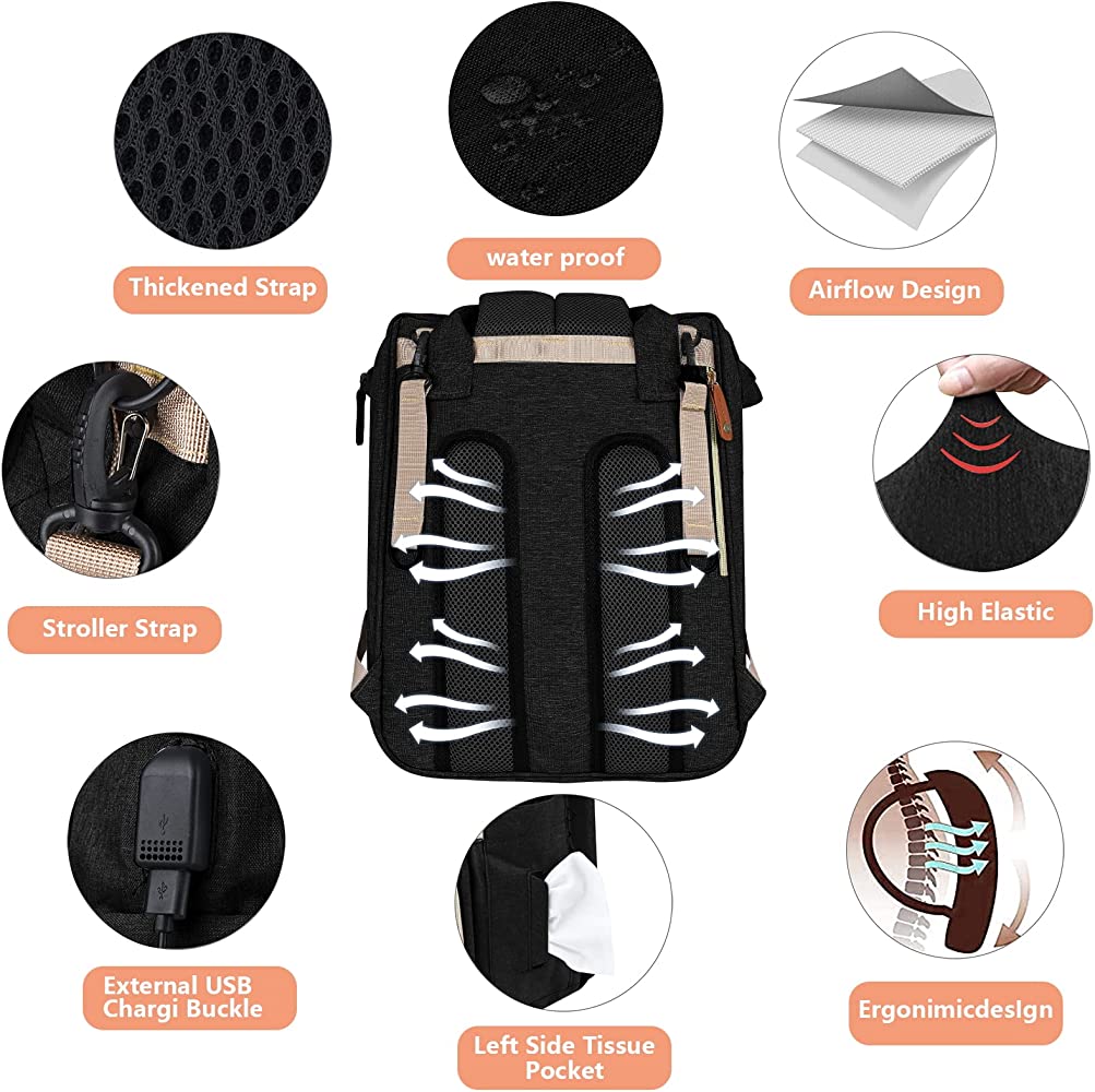 Black Waterproof Diaper Bag Backpack with USB Charging Port and Large Capacity for Girls and Boys.