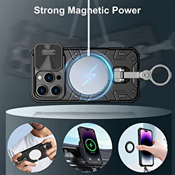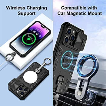 Black Wefor case for iPhone 14 Pro Max with stand, slide camera cover, military-grade shockproof protection, and compatibility with MagSafe wireless charger and magnetic car mount holder.