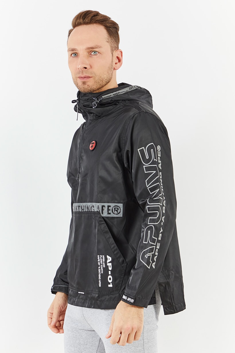 Black Windbreaker Jacket with Hood and Logo Patch for Men.