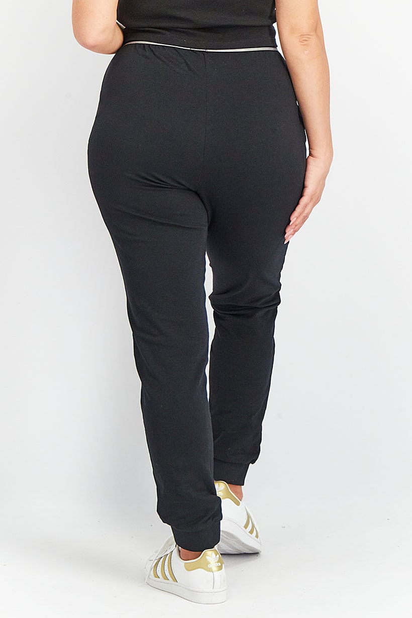 This product is suitable for women who are into training and sports. It has a sportswear fit and is made of 95% cotton and 5% elastane. The sweatpants have a pull-on bottom closure and are machine washable. They are light in thickness and have the brand logo as the pattern and print. The color of the product may slightly vary due to photographic lighting sources or monitor settings. These sweatpants are ideal for sports occasions. The size shown is international and the color family is black.