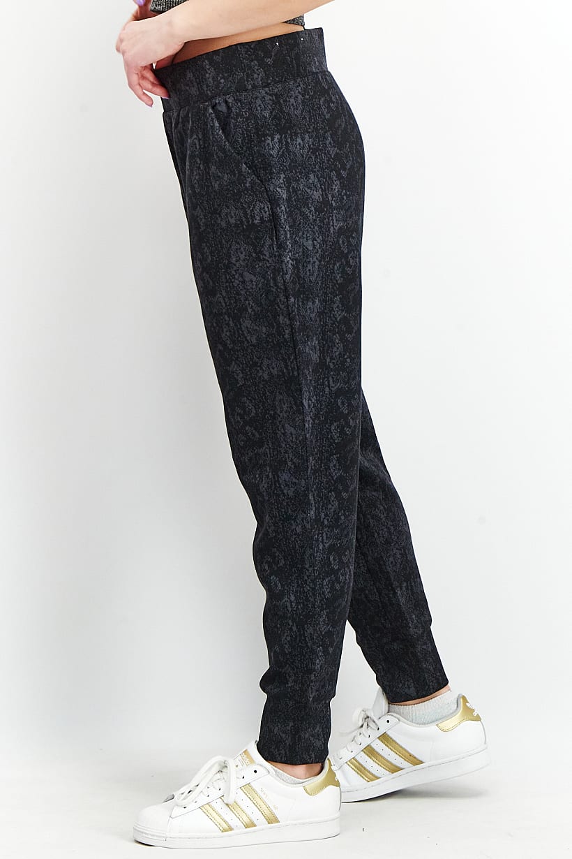 This product is suitable for machine washing and has a sportswear fit. The size displayed is international and the thickness is light, making it ideal for running. The bottom closure is a pull-on style. Please note that the product color may differ slightly due to photographic lighting or monitor settings. The fabric is made up of 51% Rayon, 43% Polyester, and 6% Spandex. These sweatpants are perfect for sports occasions and feature an allover print. They are categorized as sportswear and come in the color black.