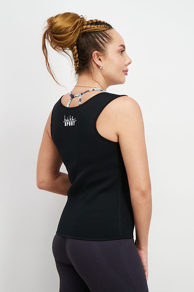 This product is easy to care for as it is machine washable. It has a sportswear fit and is available in international sizes. The fabric is made of 100% neoprene and is light in thickness, making it suitable for training. Please note that the product color may appear slightly different due to photographic lighting sources or monitor settings. The design features a plain/solid pattern and is categorized as a sportswear top. The color family is black.