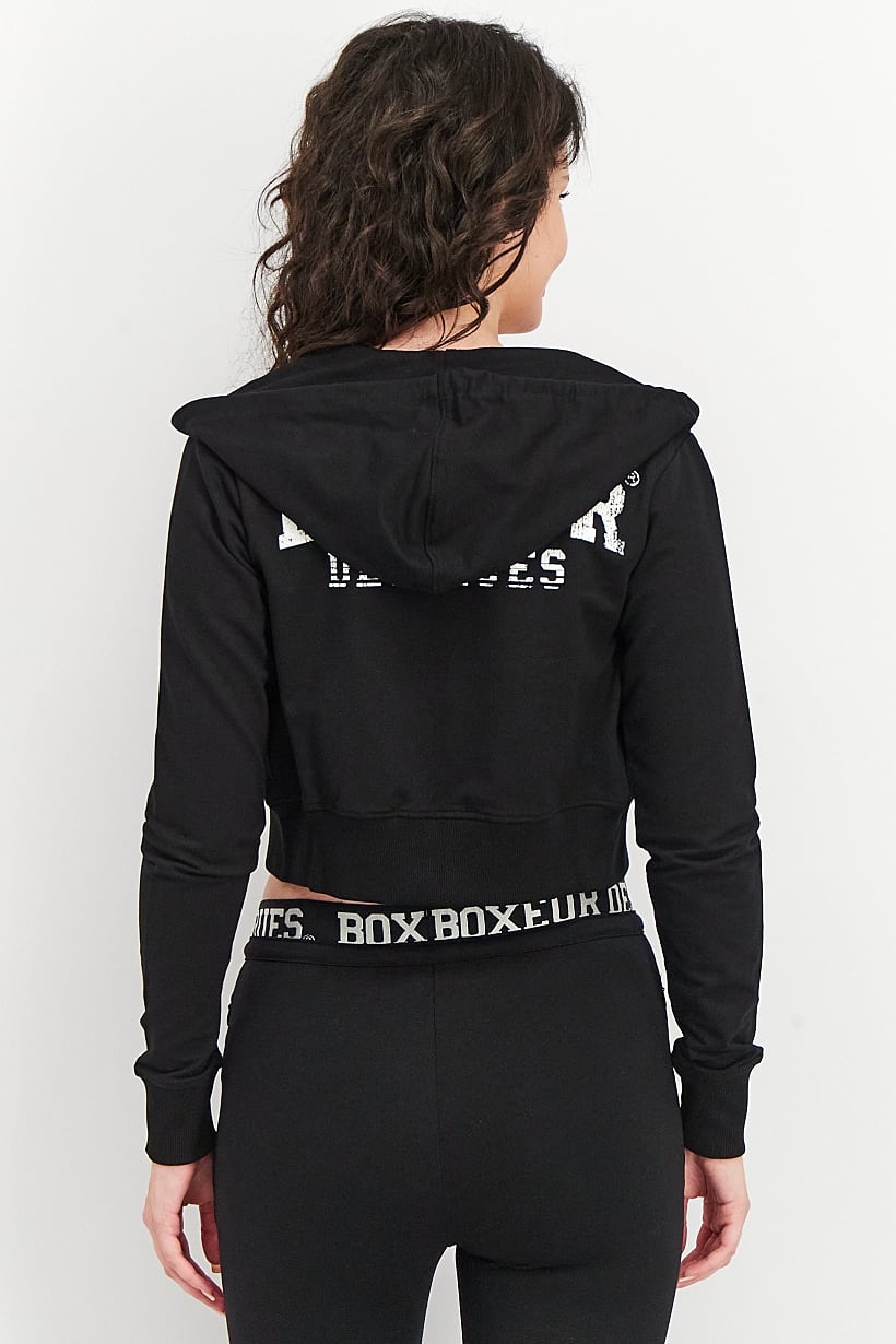 Care : Machine washable, Fit : Sportswear Fit, Ideal For : Women, Size shown : International, Sleeve Length : Long Sleeve, Thickness : Light, Type of Sport : Training, Types of Hem : Ribbed hem, Types of Neckline & Collar : Hood with drawstrings, Types of Sleeve : Longsleeve, Disclaimer : Product color may slightly vary due to photographic lighting sources or your monitor settings., Fabrics : 95% Cotton, 5% Elastane, Occasion : Sport, Pattern & Print : Brand Logo, Sportswear Type : Hoodies, Types of Closures : Zipper closure, Color Family : Black,