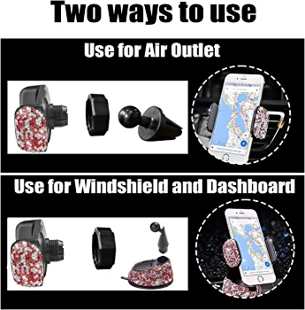 This product is a universal phone holder that comes in five different colors: white, red, pink, black, and blue. It is compatible with smartphones and can be mounted on the dashboard, vent, or windshield. The holder is made of high-quality materials that are rugged and durable, ensuring your driving safety. It is not only functional but also serves as a beautiful auto decoration. The holder is 360-degree adjustable, making it suitable for all smartphones. It is easy to install and remove without the need for any tools, and the bottom glue can be used multiple times. You can choose between two types of fixing options: vent or car sticker.