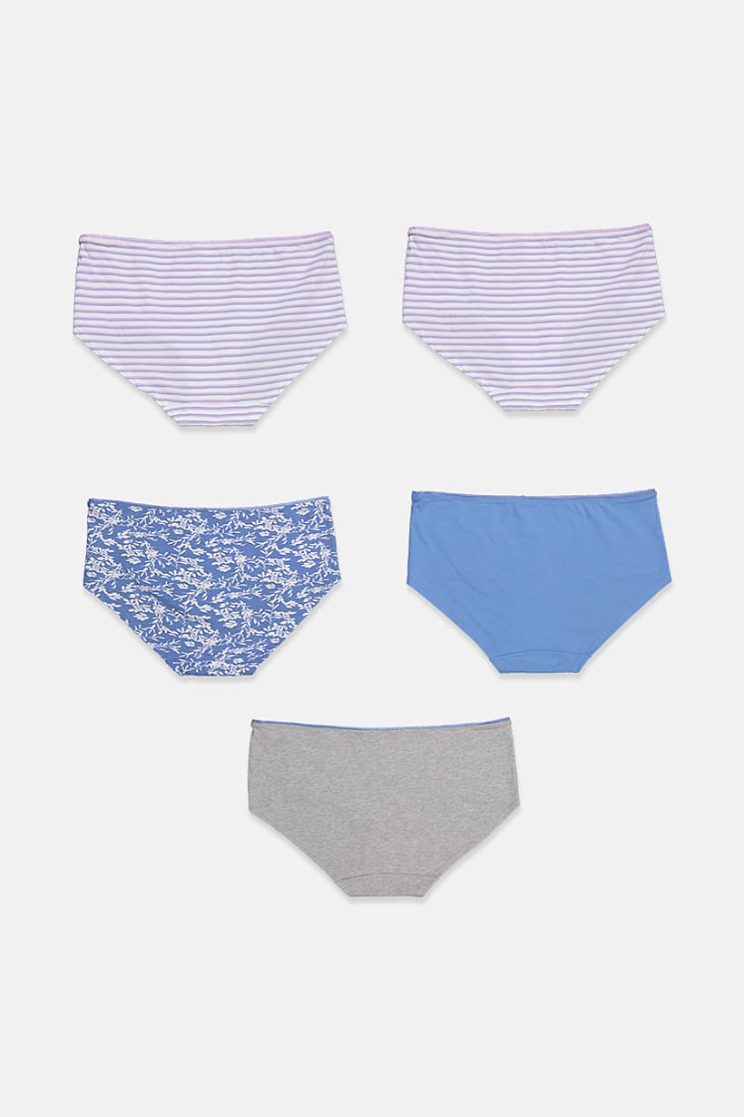 Women 5 Pcs Pull On Allover Printed Panty, Blue/Lilac Combo