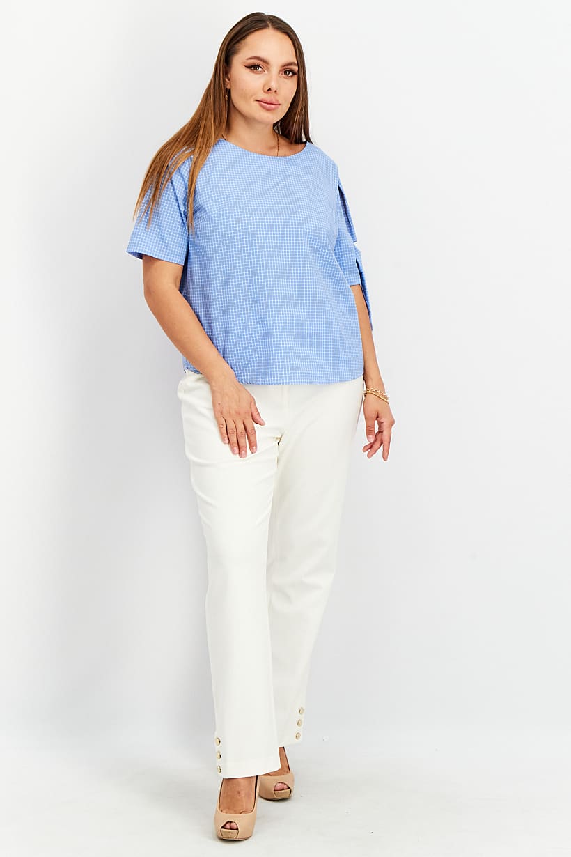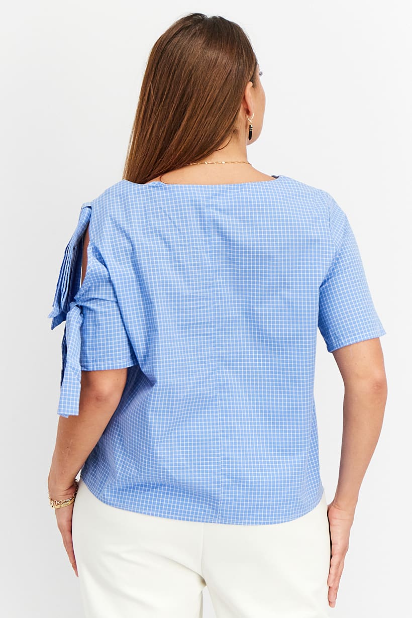 This blouse is made of 100% cotton and features a plaid pattern in shades of blue. It has a regular fit and a straight hem, with a round neckline and short sleeves. The top is designed for casual occasions and can be easily hand washed. It has a pullover closure and is available in international sizes.