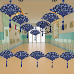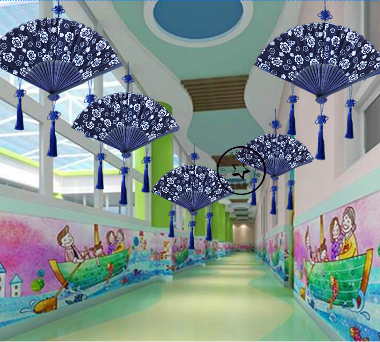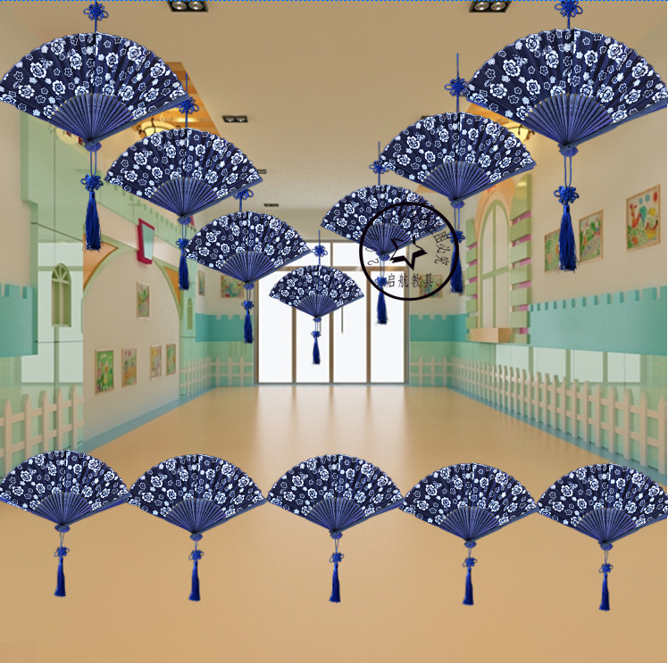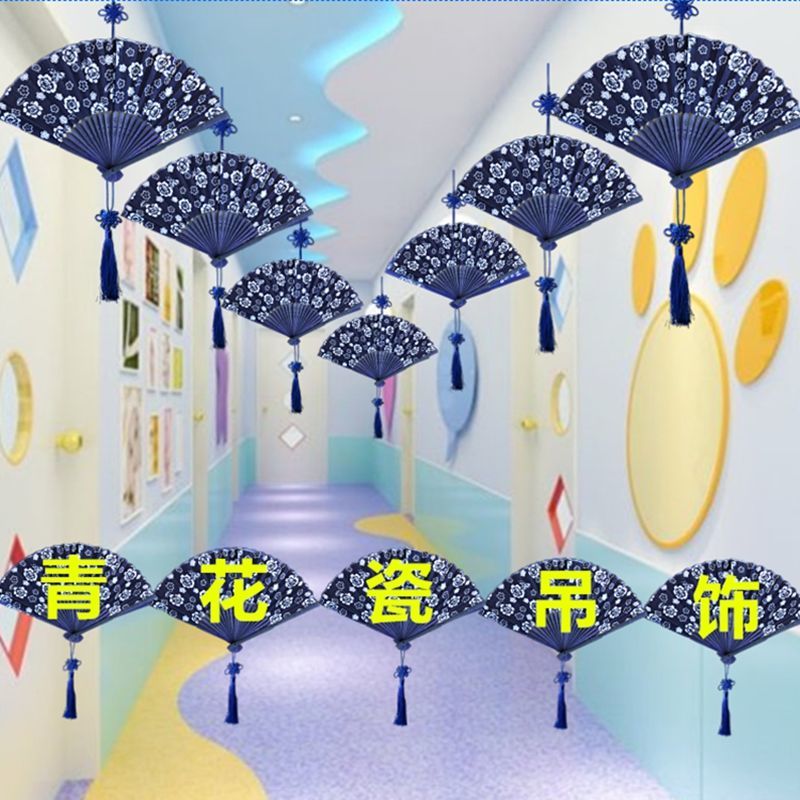 Blue and white porcelain folding fan Chinese style handicrafts decoration hanging ornaments kindergarten classroom corridor environment layout