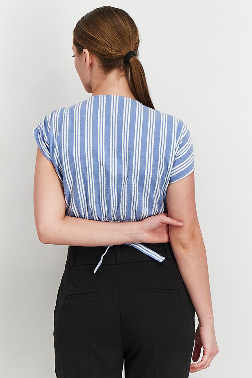 | descriptionOriginal | Care : Machine washable, Fit : Regular fit, Size shown : EU, Top Style : Blouse, Types of Hem : Tie hem, Types of Neckline & Collar : V-neckline, Types of Sleeve : Short sleeve, Fabrics : 99% Cotton, 1% Elastane, Occasion : Casual, Pattern & Print : Stripe, Types of Closures : Tie closure, Color Family : Blue, |