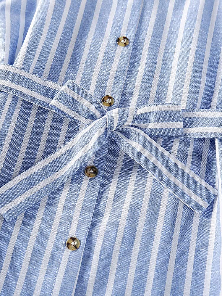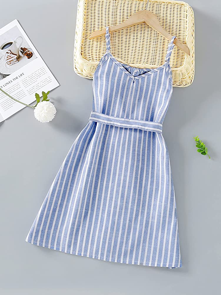 Blue and white striped summer dress with spaghetti straps, button front, and belt for girls by Romwe.