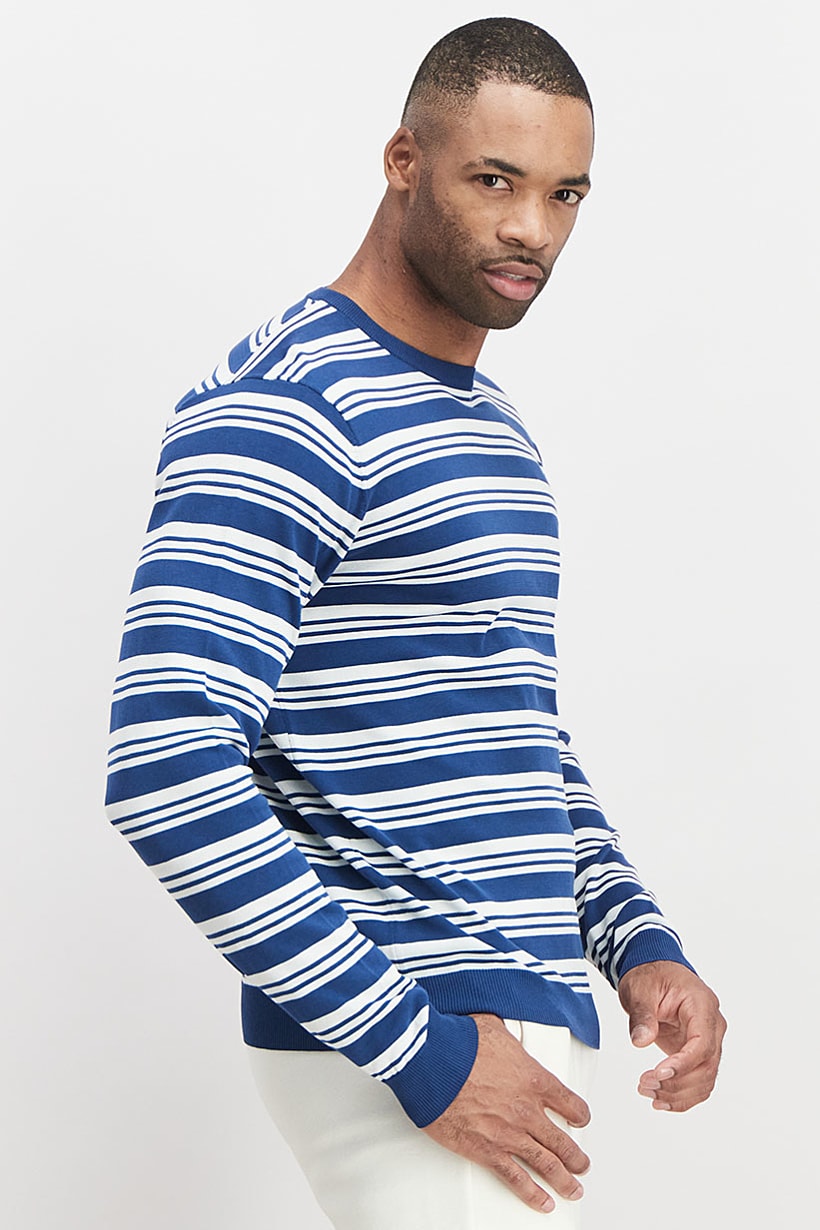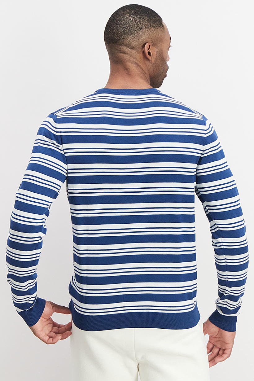 This product is made of 100% cotton and is machine washable. It features a crew neckline and long sleeves, with a pullover closure. The sweatshirt style is a pullover, with a light thickness and a stripe pattern. The color family is blue and white, but please note that the product color may vary slightly due to photographic lighting sources or monitor settings. The size shown is international.