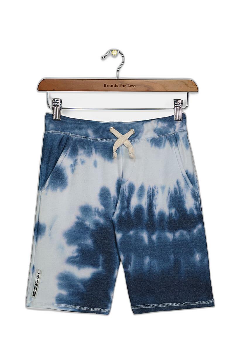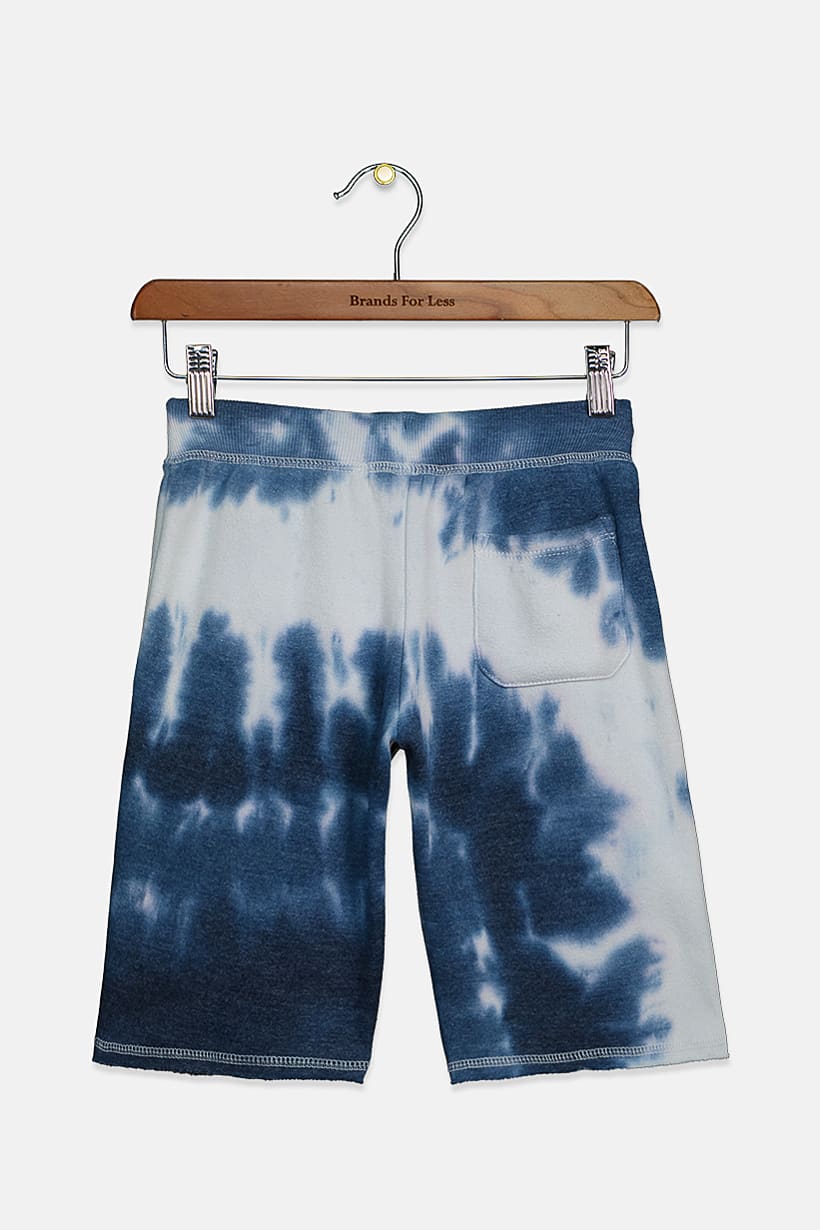 Blue and white tie-dyed fleece shorts with drawstring for boys.
