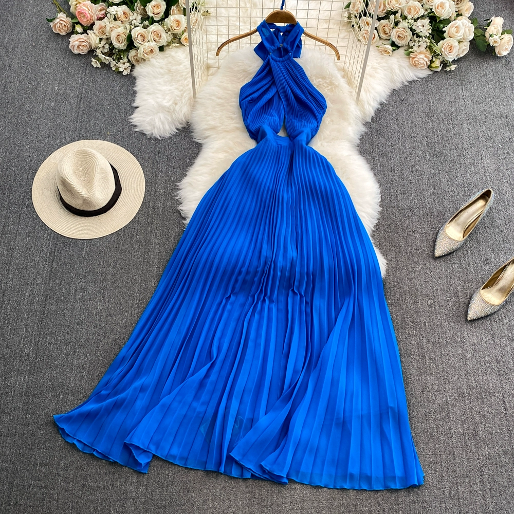 Blue beach dress for women on seaside vacation, super fairy long skirt, fashionable French halter neck, backless pleated dress, summer