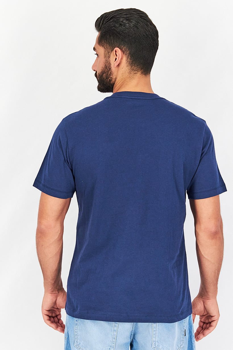 This navy blue t-shirt is perfect for casual occasions and is designed for men. It features a crew neckline and short sleeves with a straight hem. The graphic print adds a stylish touch to the 100% cotton fabric. It is machine washable and has a pullover closure. Please note that the product color may vary slightly due to lighting or monitor settings. The size shown is international.