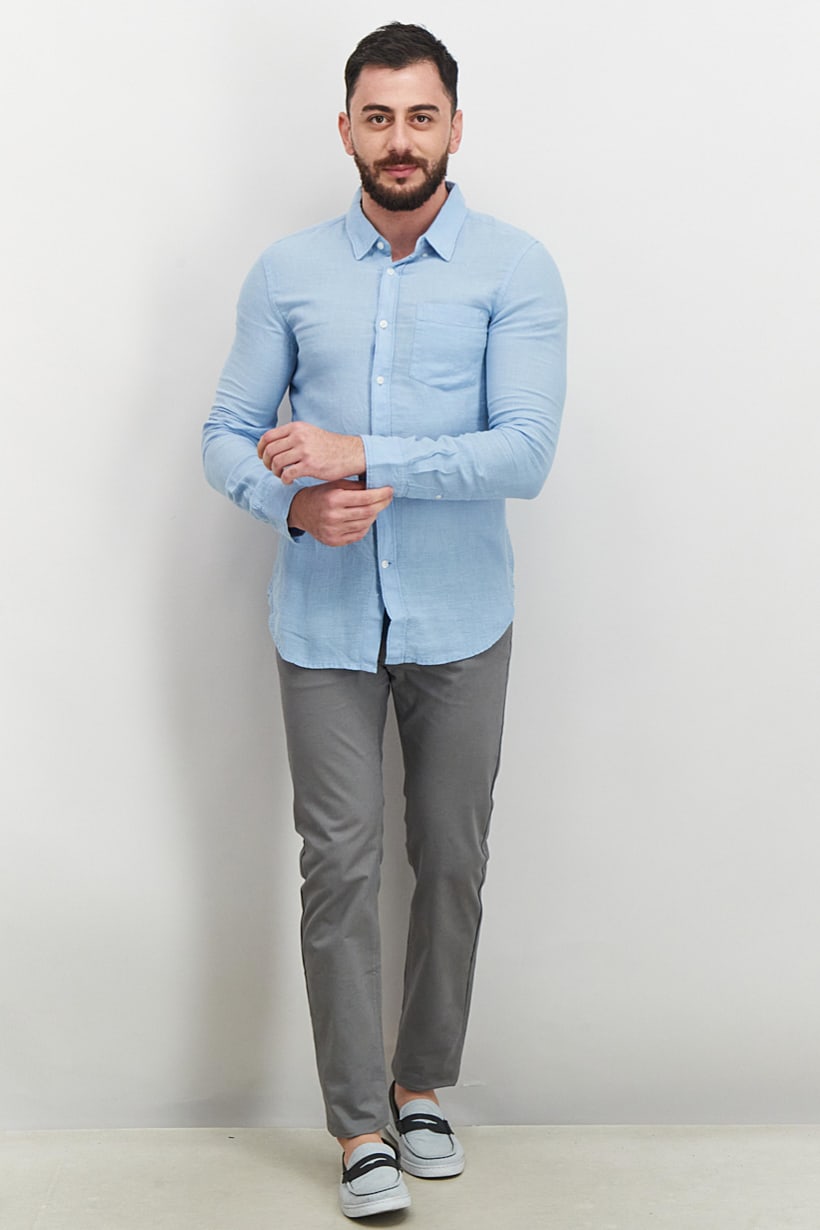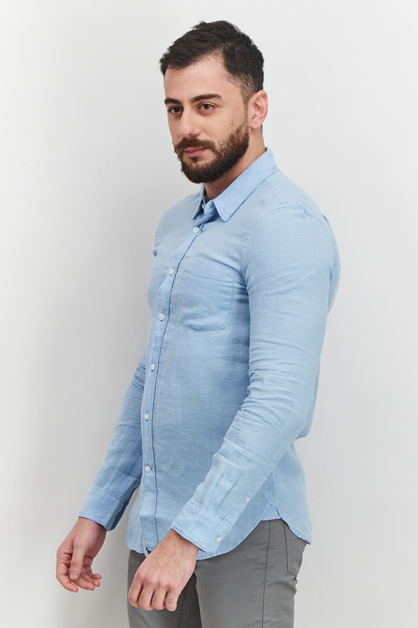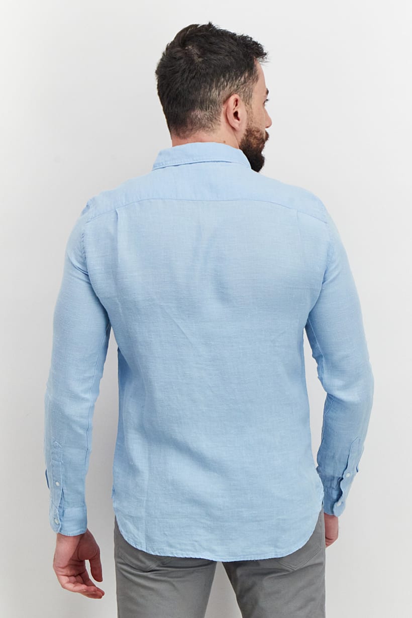 Care : Machine washable, Fit : Regular fit, Size shown : International, Sleeve Length : Long Sleeve, Types of Hem : Straight hem, Types of Neckline & Collar : Spread collar , Disclaimer : Product color may slightly vary due to photographic lighting sources or your monitor settings., Fabrics : 100% Linen, Occasion : Casual, Pattern & Print : Plain/Solid, Types of Closures : Button, Color Family : Blue,