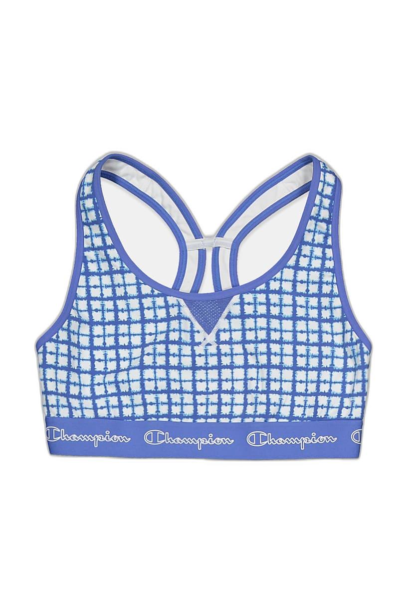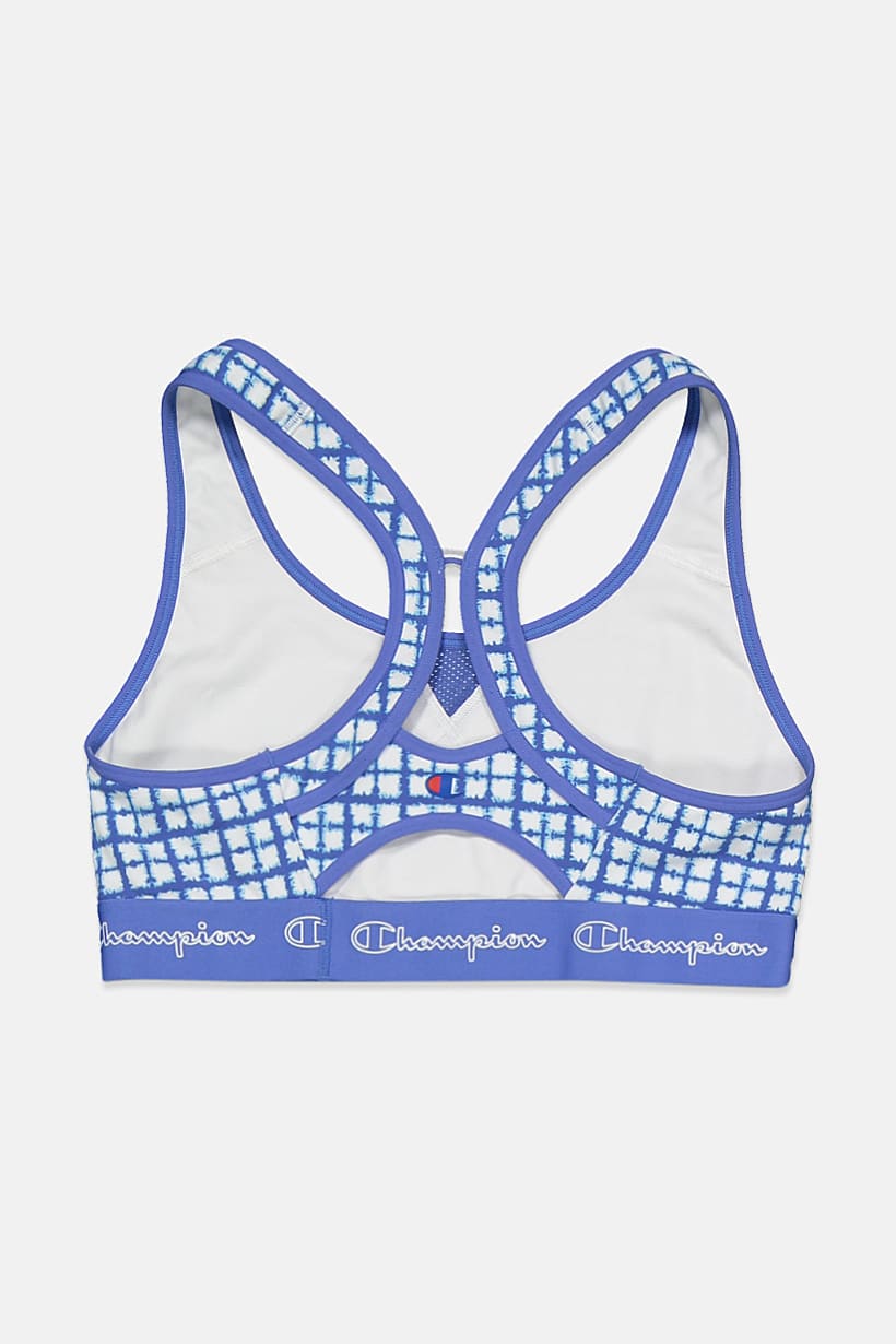 This sports bra is designed for training and has a sportswear fit. It is sleeveless and made of light fabric that is 90% cotton and 10% elastane. The allover print adds a stylish touch to the blue color family. The bra has a pullover closure and is machine washable. Please note that the product color may vary slightly due to photographic lighting sources or monitor settings. It is perfect for sports occasions. The size shown is international.
