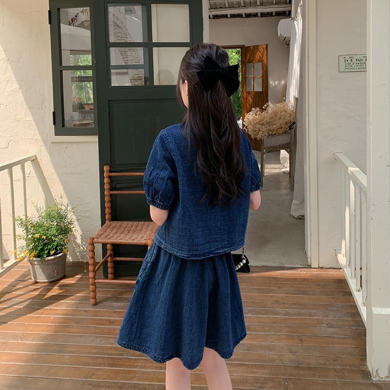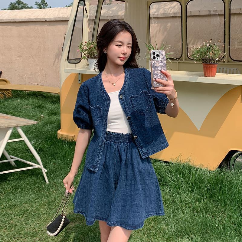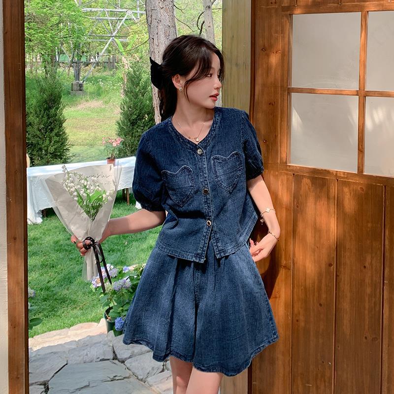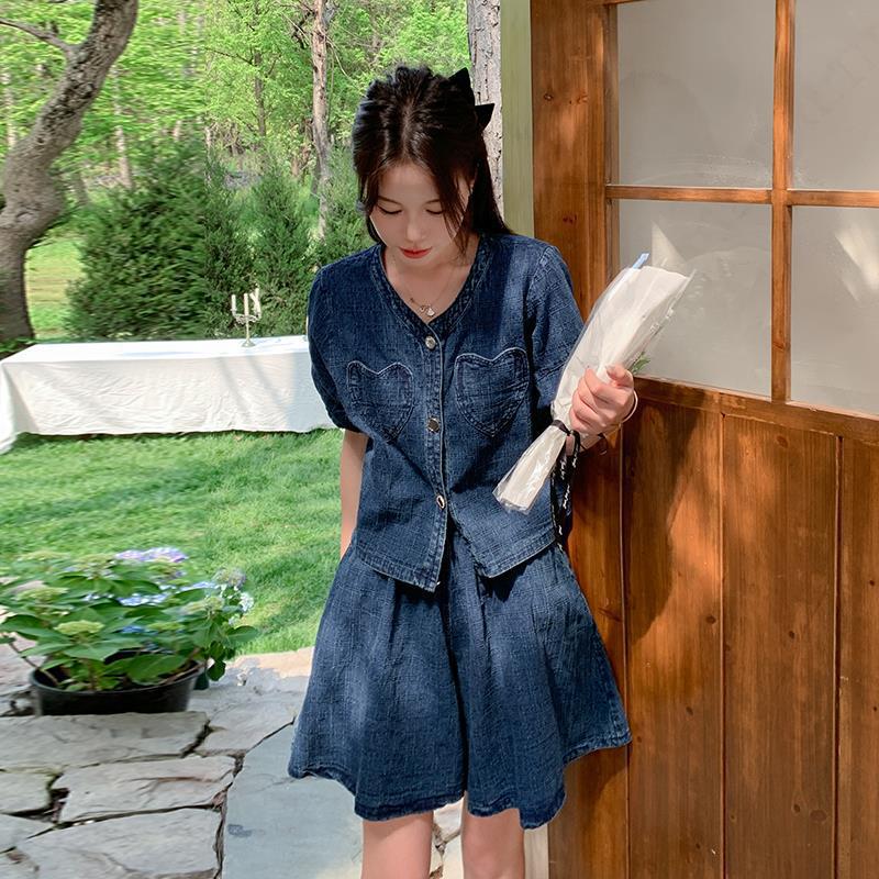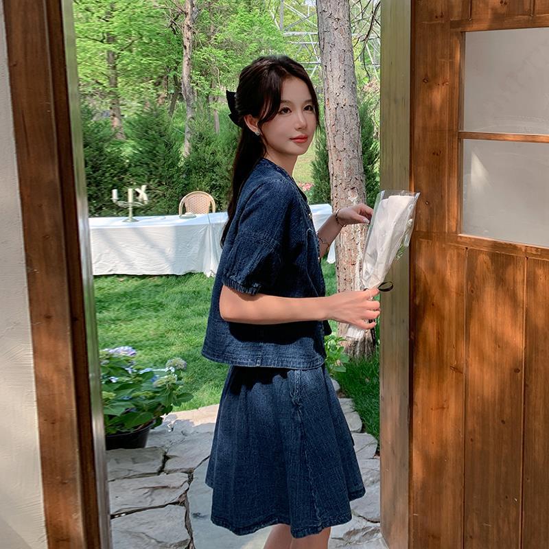 | nameOriginal | Blue Denim Cardigan Skirt Two-piece Set Women's 2024 Summer New Hong Kong Style Retro Fashion Age-reducing Slimming suit |