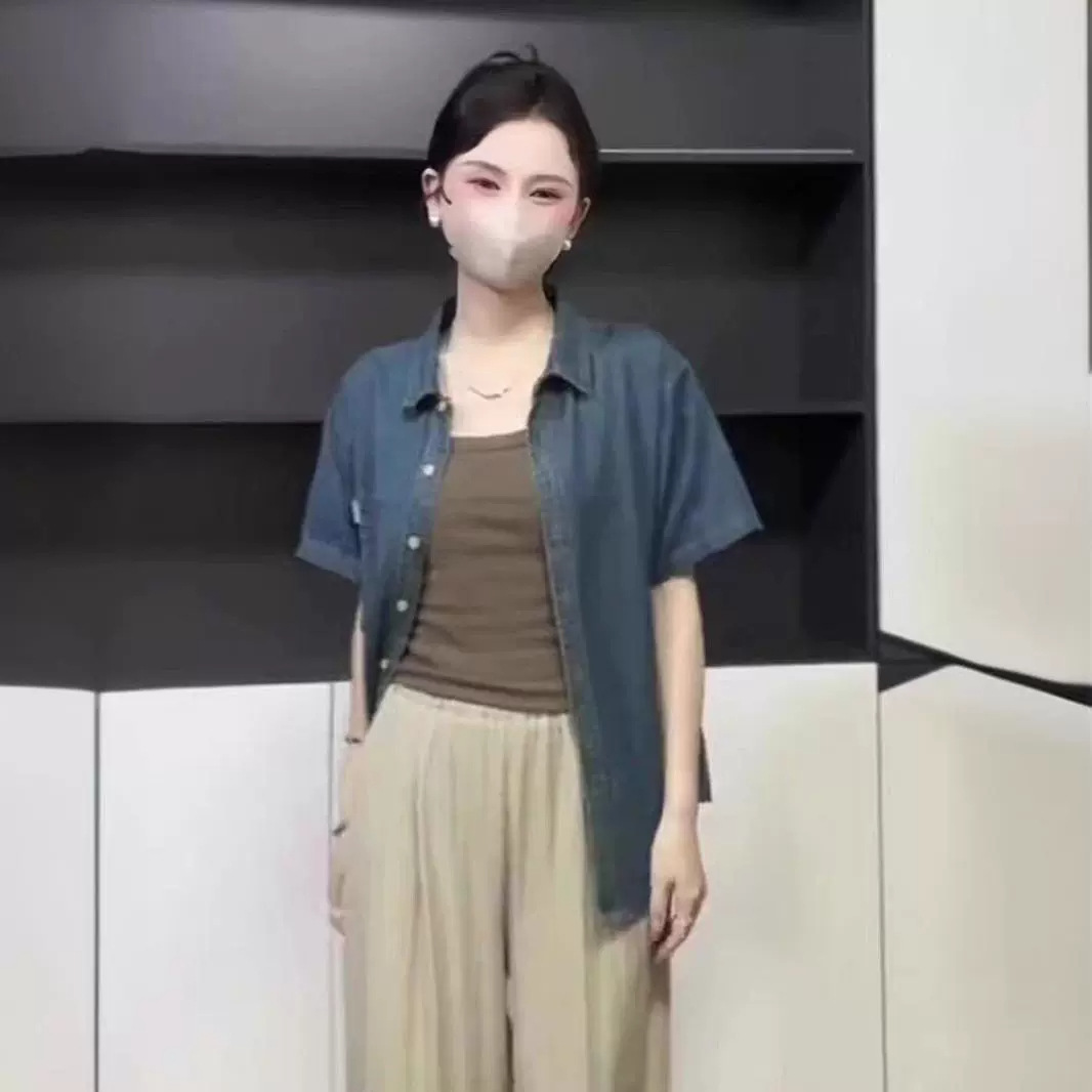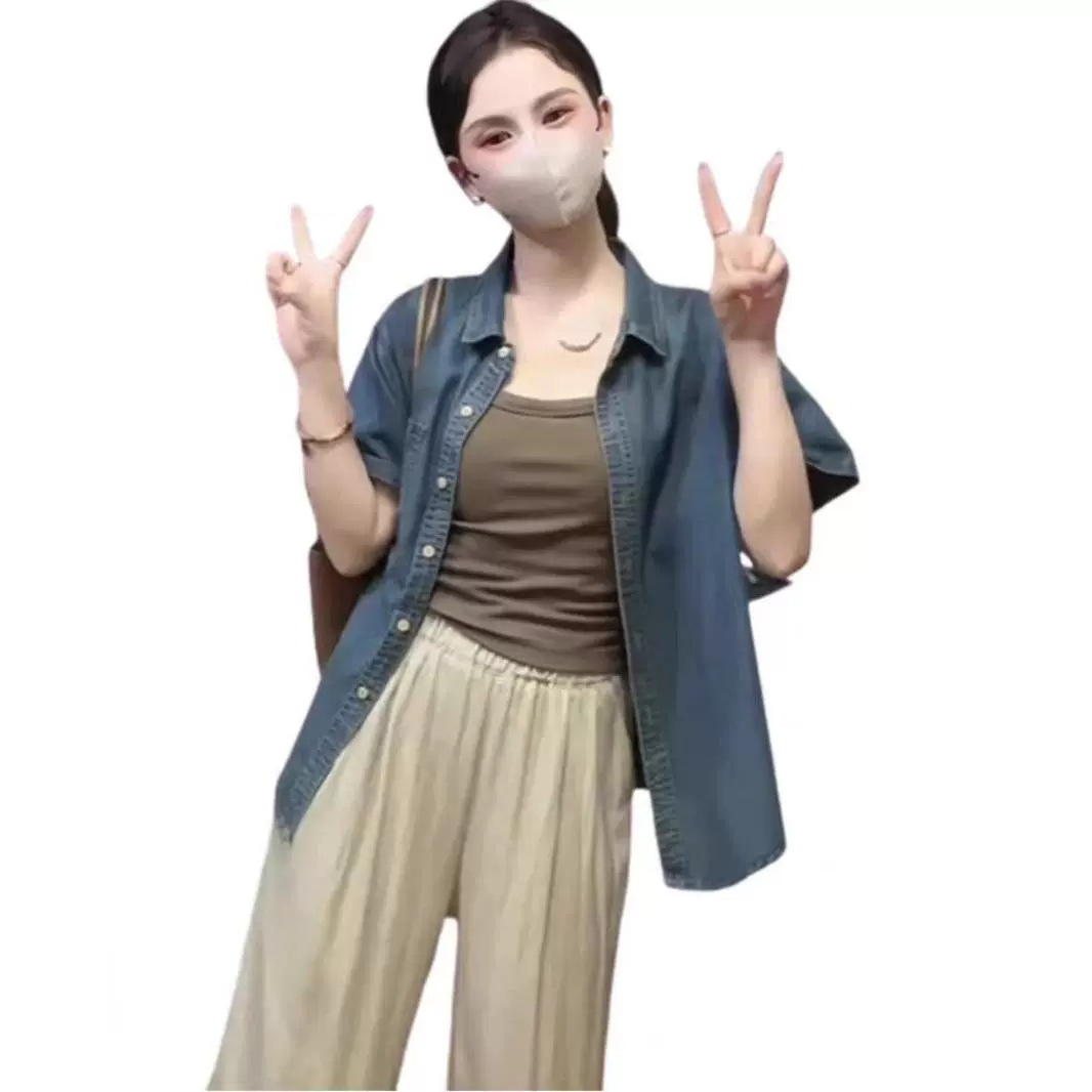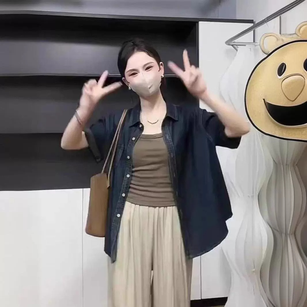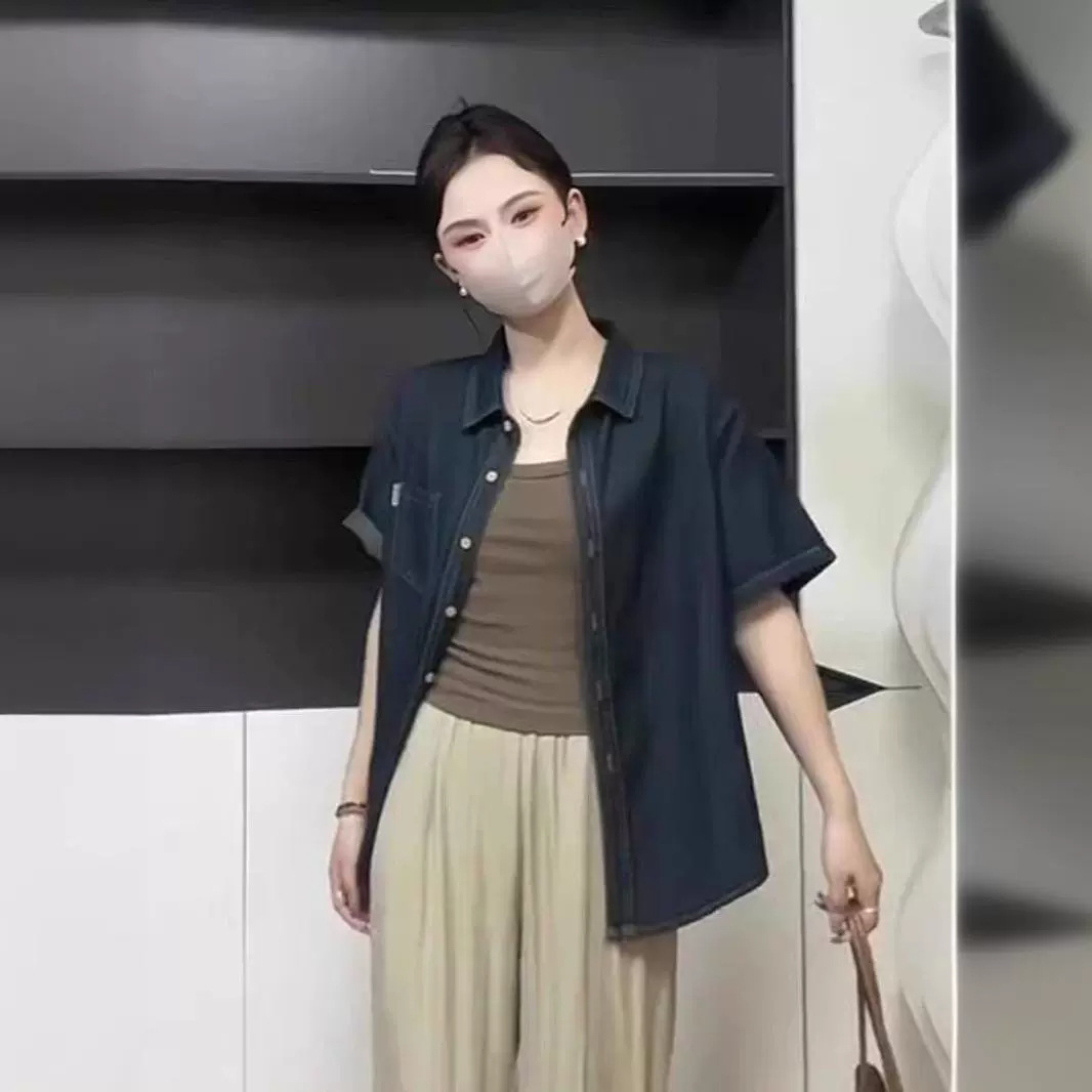 | nameOriginal | Blue Denim Short-sleeved Shirt Women's Summer New Loose Casual Stacked-up Retro Hong Kong-style Polo Collar Cardigan Top |