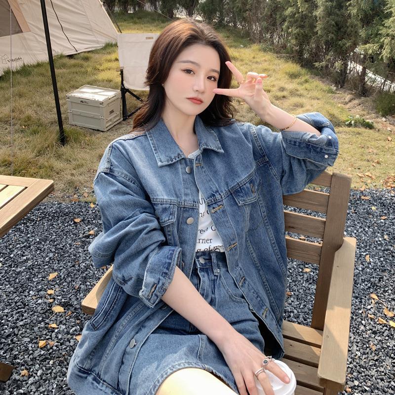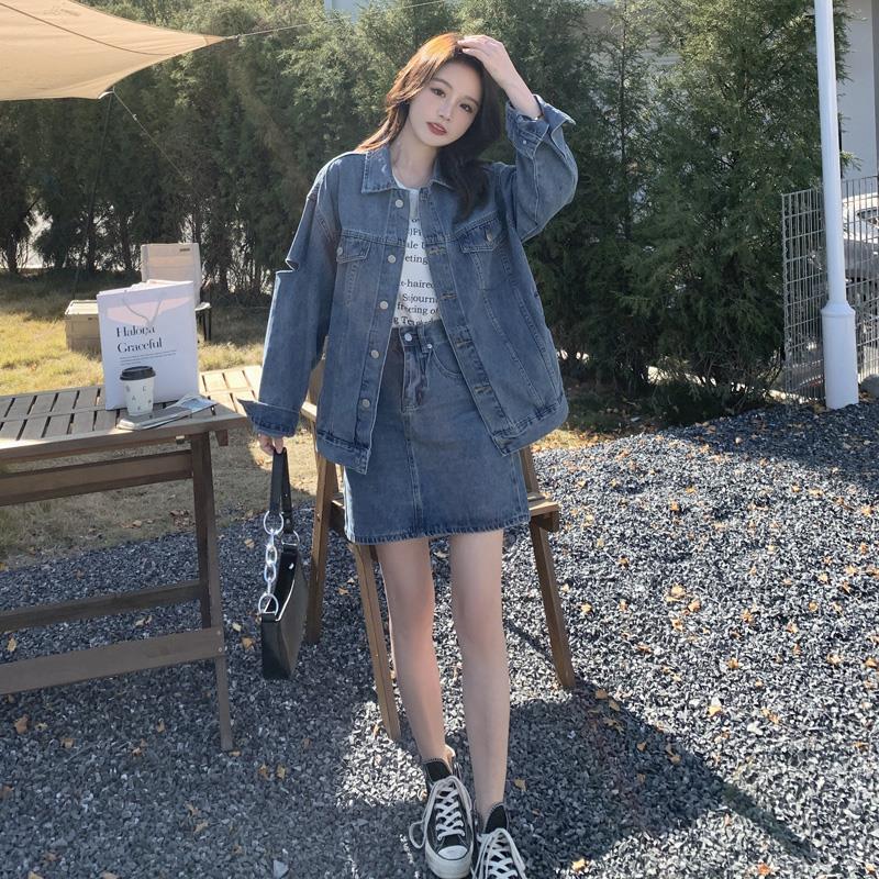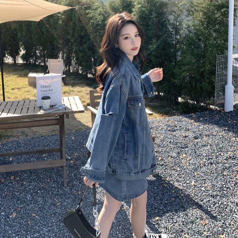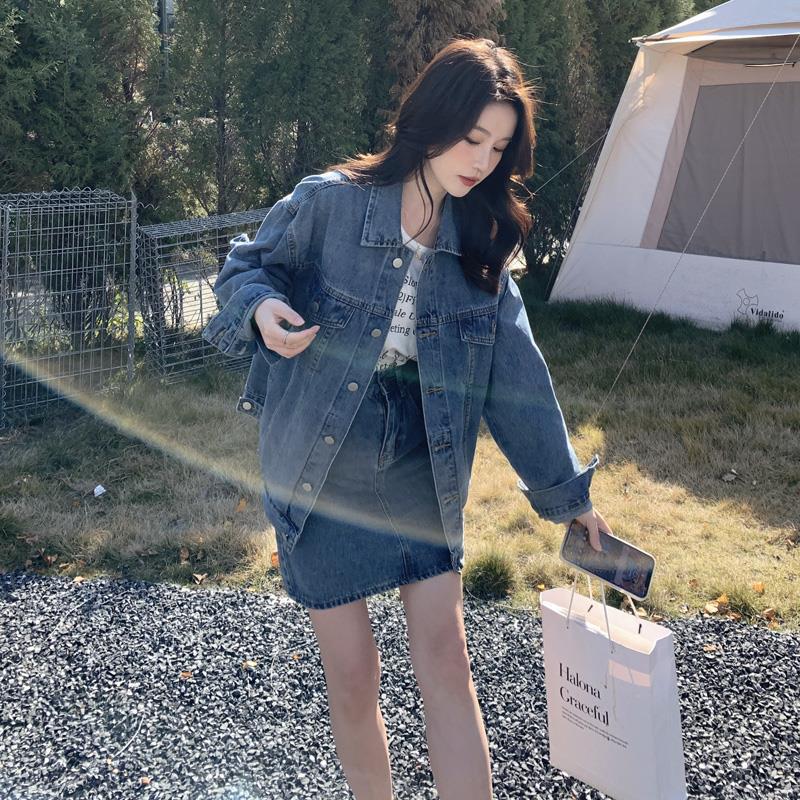 | nameOriginal | Blue denim skirt suit women's 2024 new spring and autumn Hong Kong style loose coat high waist skirt two-piece set |