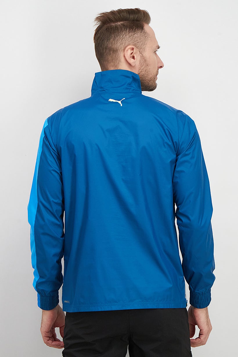This product is a sportswear jacket with long sleeves, suitable for training and other sports activities. It features a mock neckline and collar, and is made of 100% polyester fabric. The jacket has a brand logo and graphic print, and comes in a blue color. It can be machine washed and has both pullover and zipper closures. The jacket has a light thickness and a sportswear fit, and is available in US size.