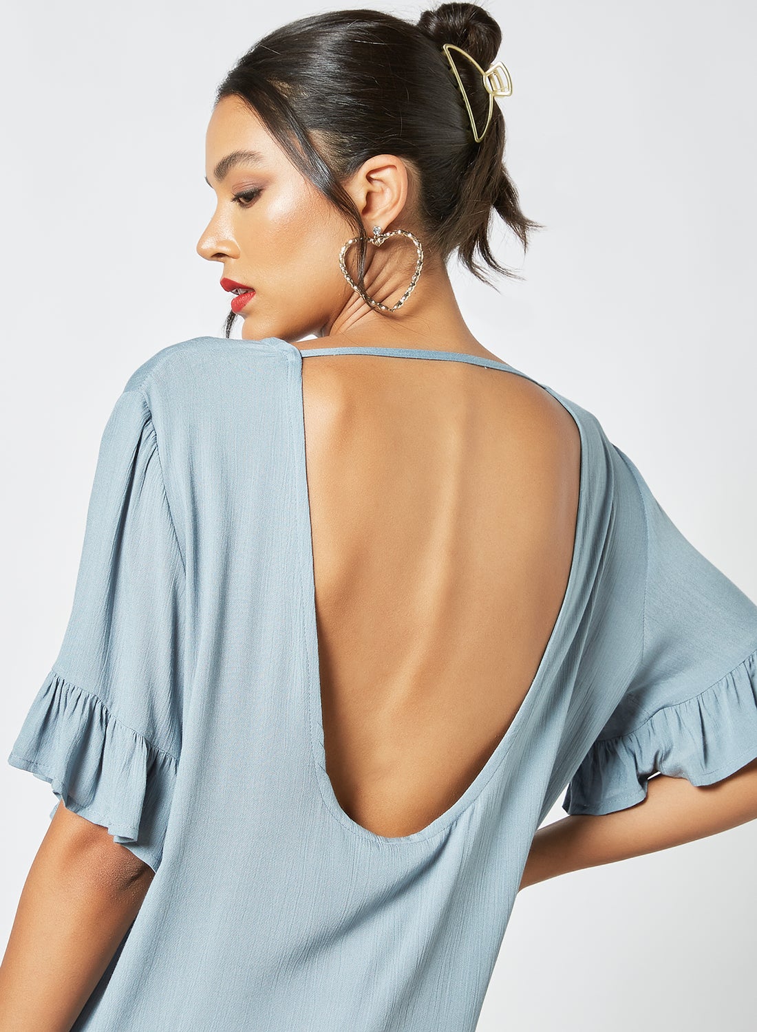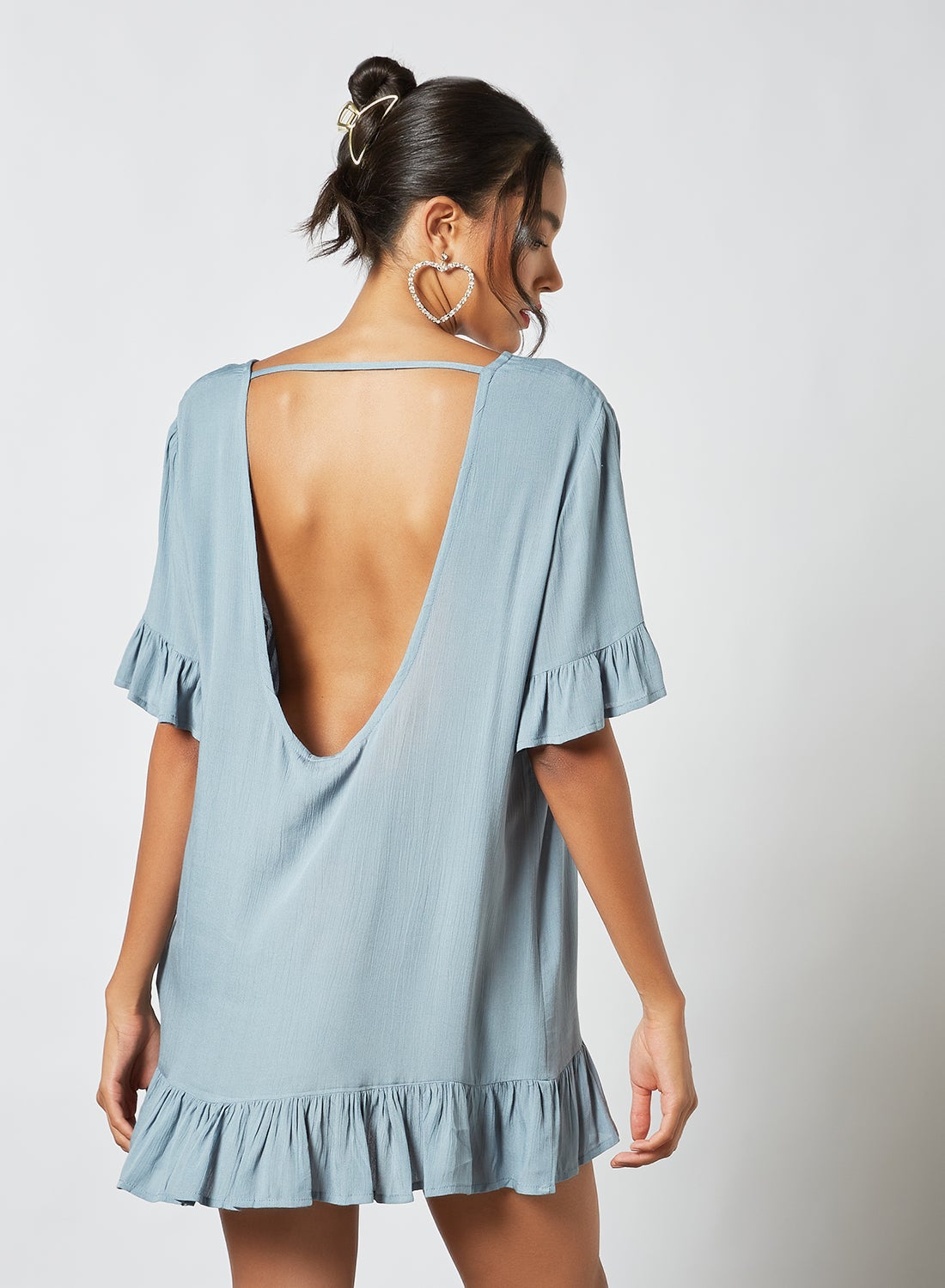 This product features a soft and airy blend of polyester fabric that provides a comfortable wearing experience. It comes with a stylish V-neck design and short sleeves, along with a low scoop back detail that adds a touch of elegance. The mini length and regular fit make it a perfect choice for any occasion. To ensure its longevity, please follow the care label instructions when washing.