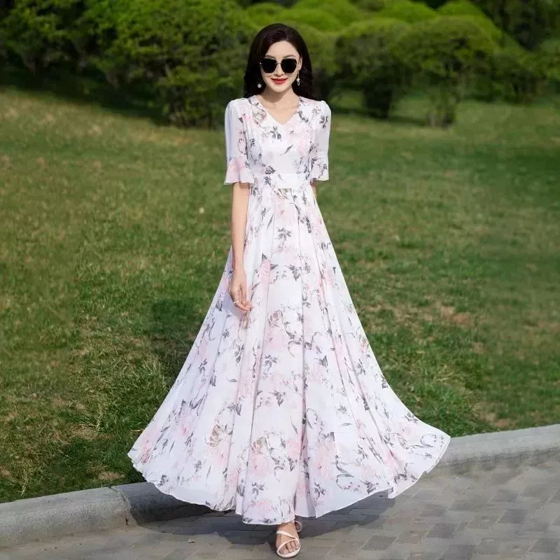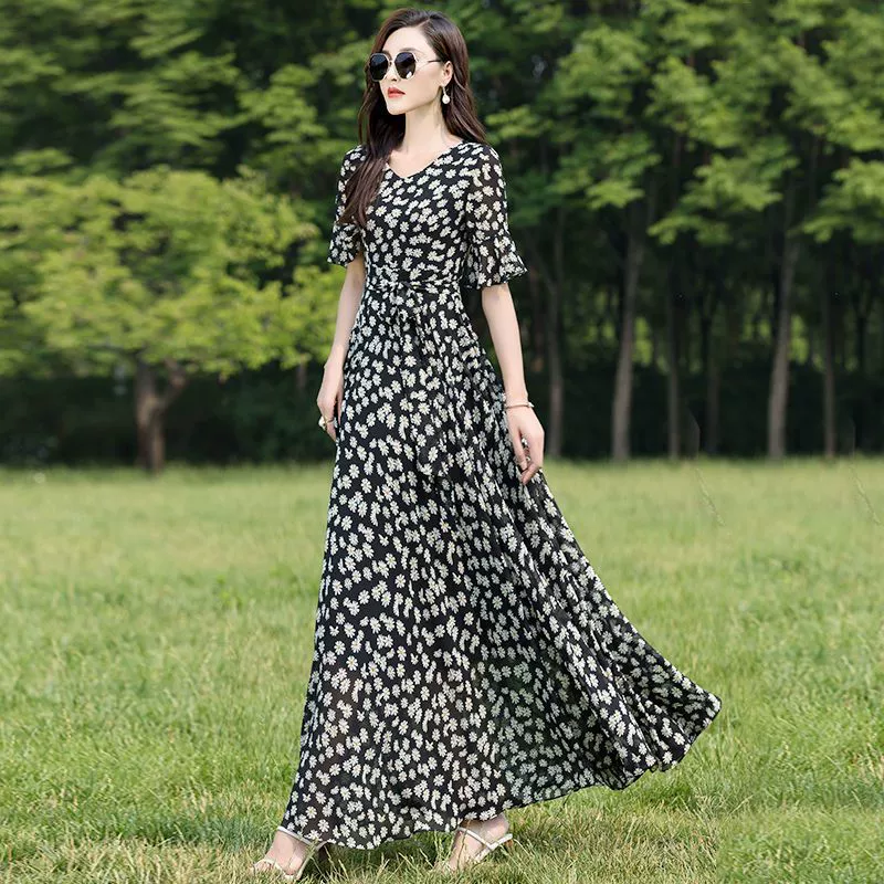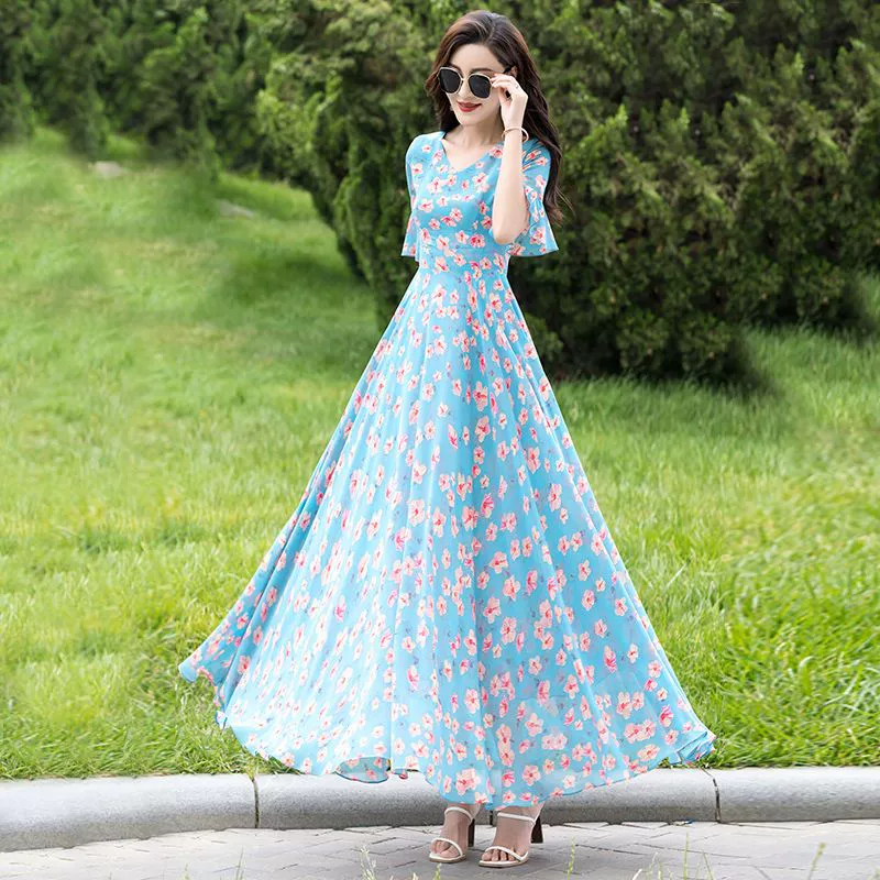 | nameOriginal | Blue floral extra-long ankle-length chiffon dress |
