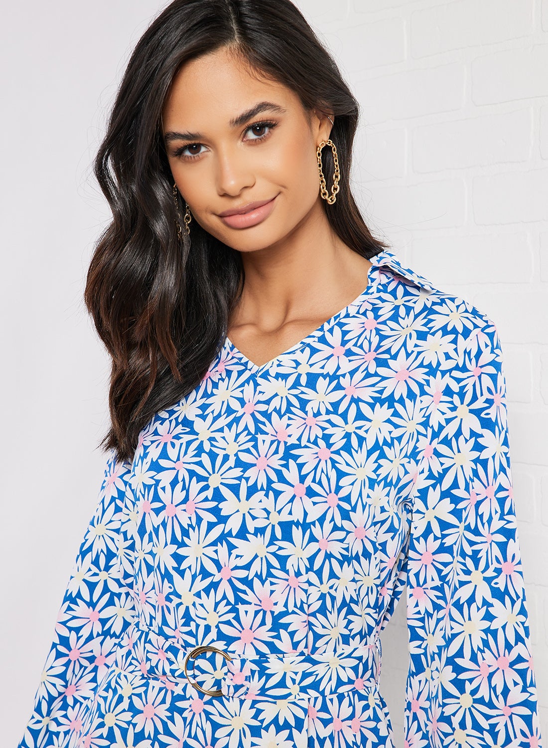 Blue Floral Print Midi Dress with V-Neckline, Long Sleeves, and Waist Belt for a Casual Look.