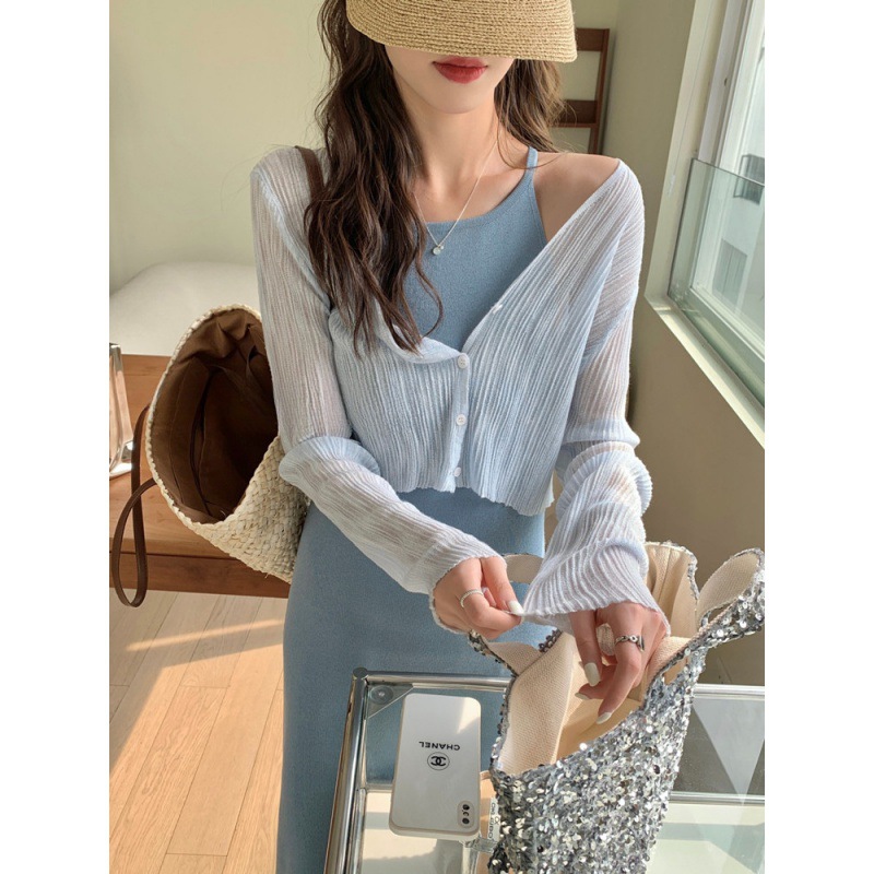 Blue Ice Silk Knitted Short Sunscreen Cardigan Women's Summer Thin Skirt Shawl Collar Air-conditioning Shirt Small Waistcoat