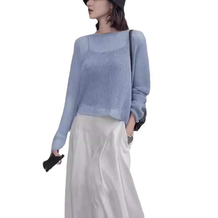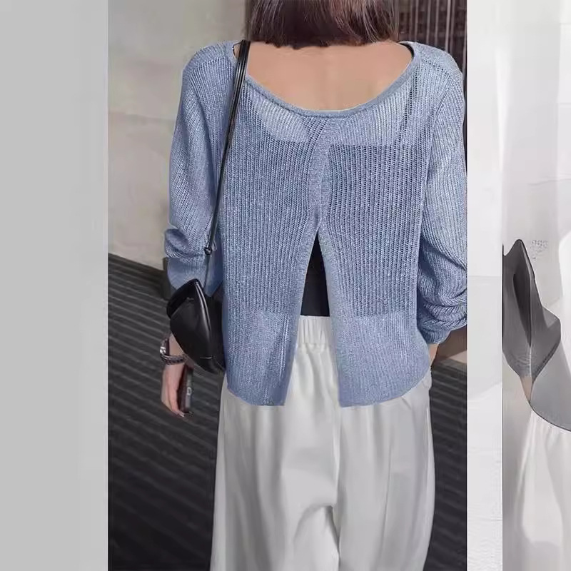 | nameOriginal | Blue Ice Silk Tulle Back Hollow-out Split Sunscreen Blouse Women's Summer Outer Short Knitted Air-conditioning Shirt Top |