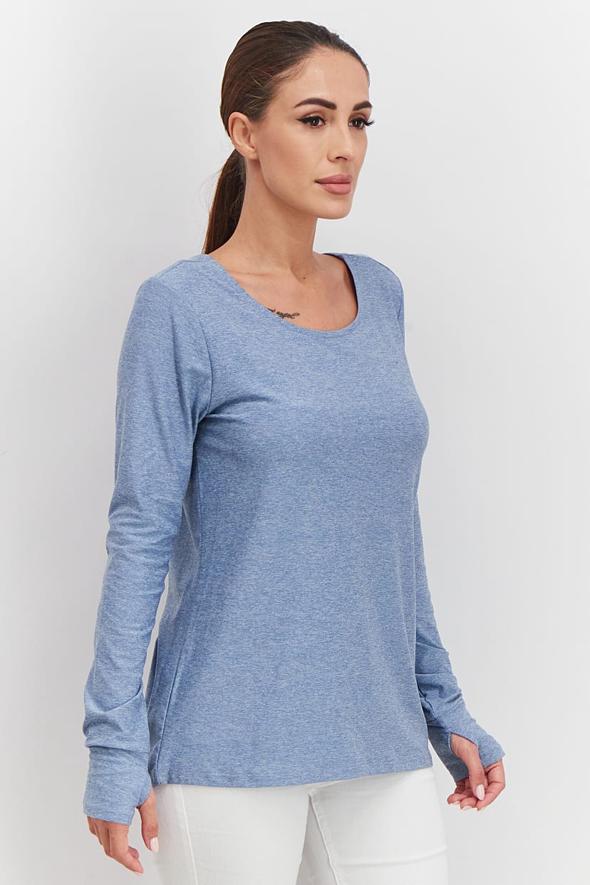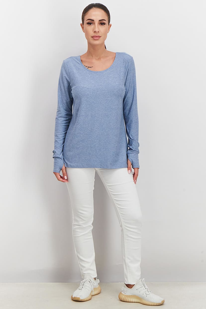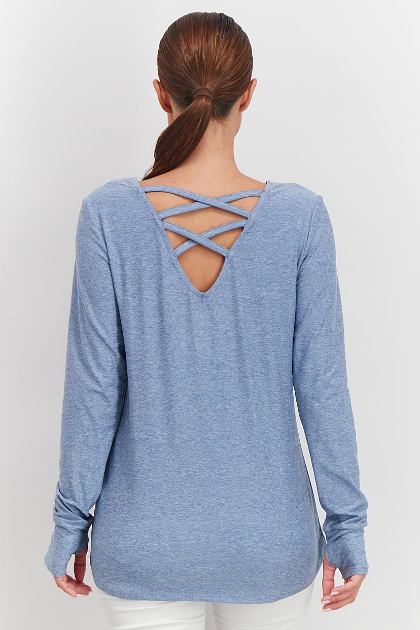 Blue Knit Top with Criss Cross Back for Active Women.