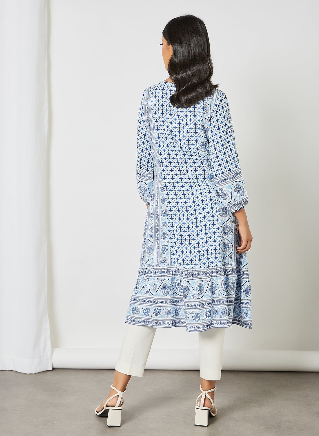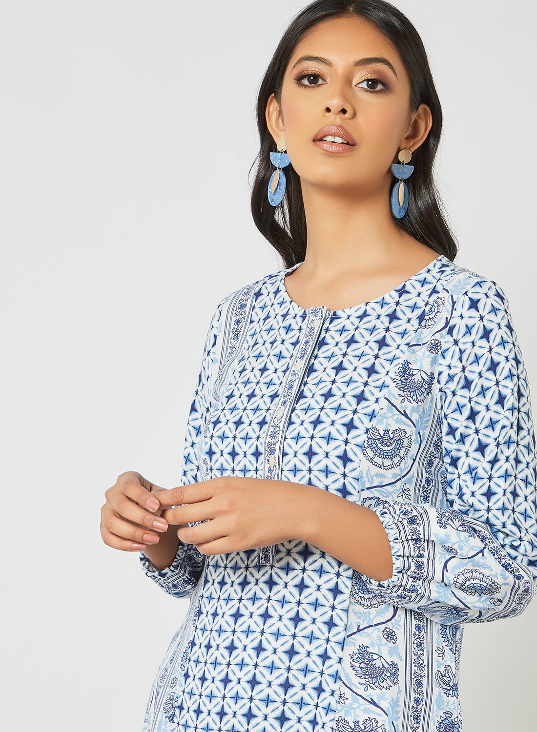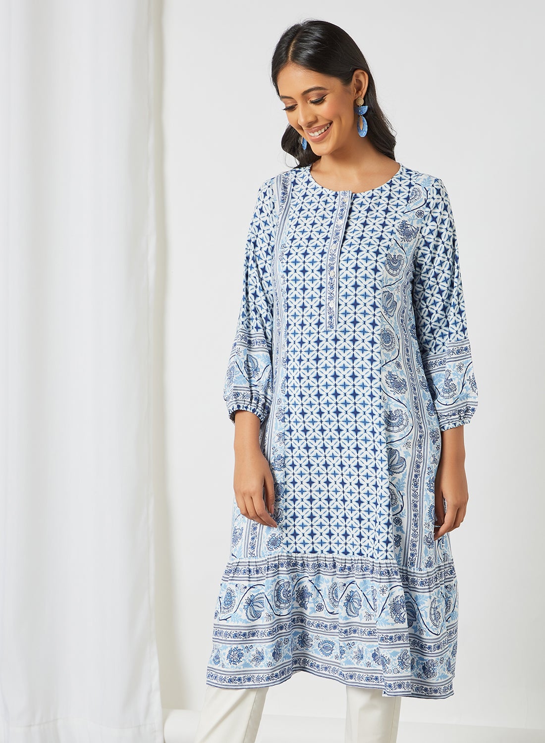 This product features a comfortable and gentle viscose fabric that has been expertly woven. It showcases a combination of scarf and border prints that add a unique touch to its design. The top has a round neckline and three-quarter sleeves for a stylish look. It also has a button placket on the front for easy wear. To maintain its quality, kindly follow the care label instructions when washing.
