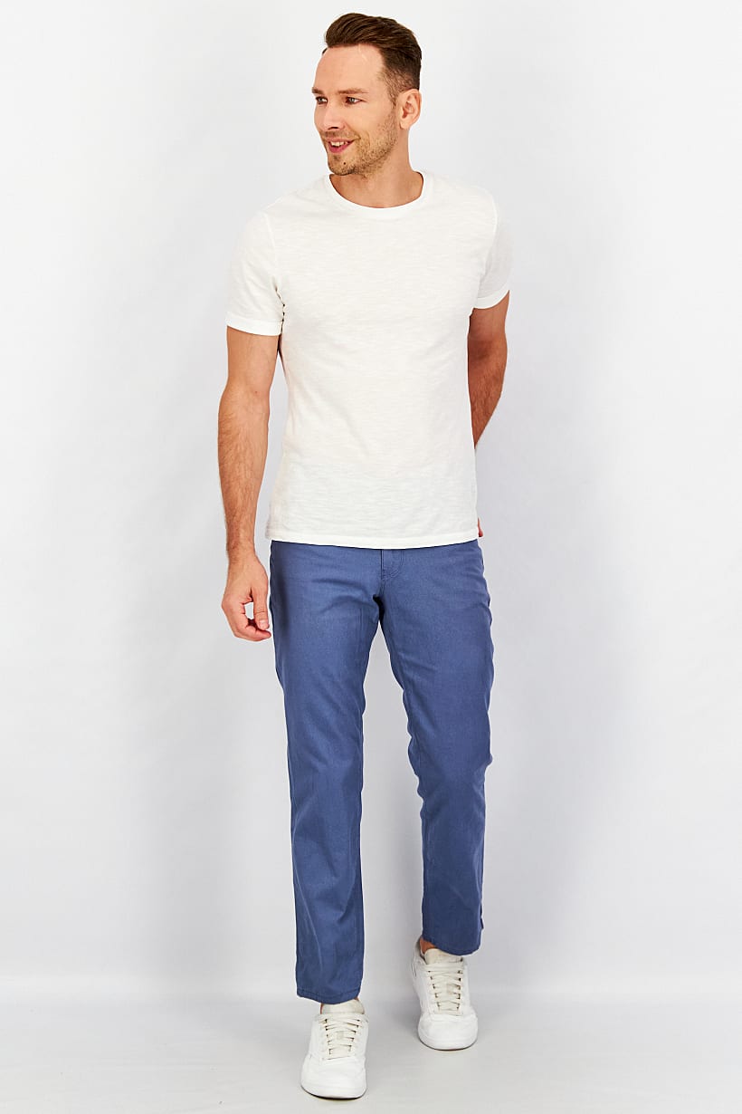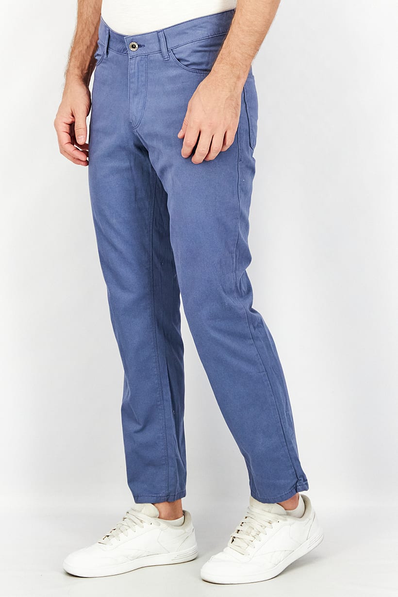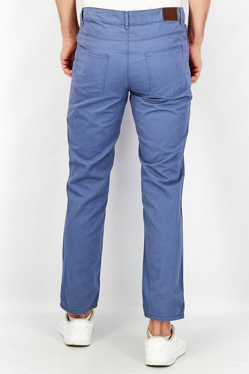 Care : Machine washable, Fit : Slim fit, No of pockets : 5, Pant Style : Chino, Size shown : Inches, Stretch Type : No stretch, Types of Jeans Rise : Mid rise, Bottom Closure : Button, Bottom Style/Pattern : Belt loops, Disclaimer : Product color may slightly vary due to photographic lighting sources or your monitor settings., Fabrics : 100% Cotton, Occasion : Casual, Pattern & Print : Plain/Solid, Color Family : Blue,