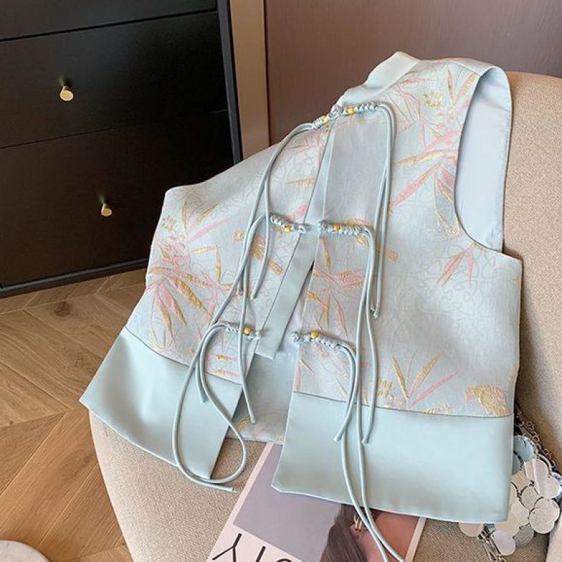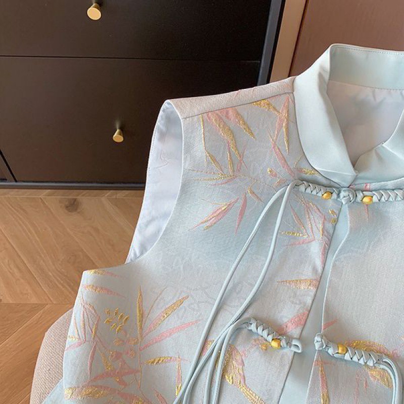 Blue New Chinese Style Gold Silk Bamboo Leaf Jacquard Tassel Vest 2024 Women's Spring and Summer National Style High-end Waistcoat