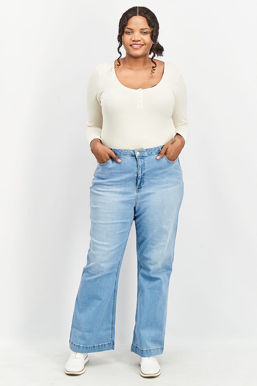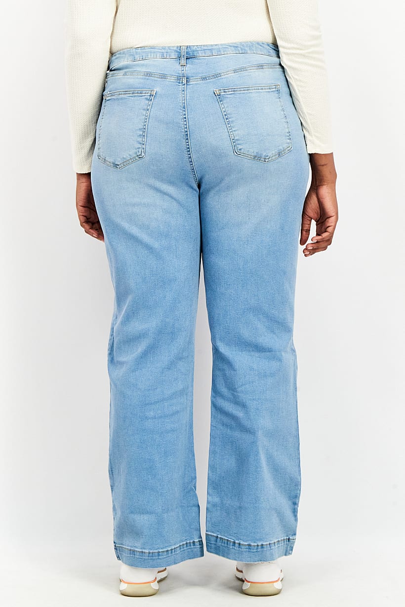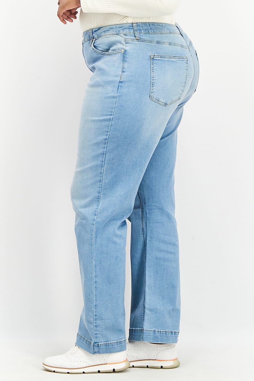 Bottom Hem : Flared, Care : Machine washable, Fit : Plus Size, Ideal For : Women, Leg Style : Flare, Size shown : US, Stretch Type : No stretch, Bottom Closure : Button, Zipper fly, Bottom Style/Pattern : Five pocket style, Belt loops, Disclaimer : Product color may slightly vary due to photographic lighting sources or your monitor settings., Fabrics : 98% Cotton, 2% Spandex, Occasion : Casual, Pattern & Print : Washed, Color Family : Blue,