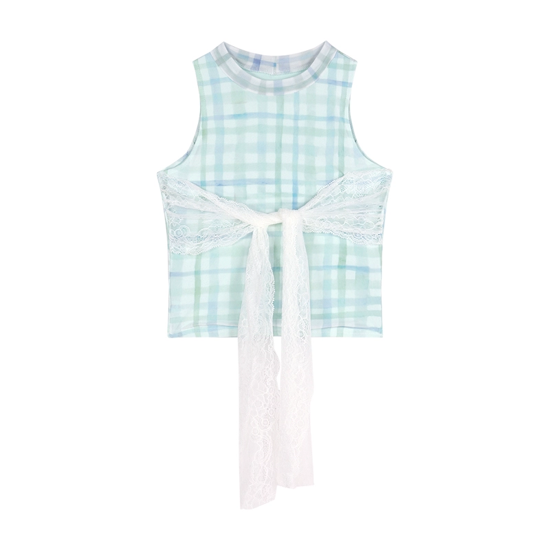 Blue plaid slim fit lace design halter neck strap