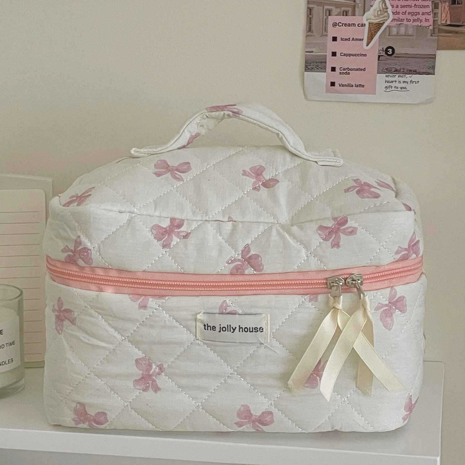 | nameOriginal | Blue Powder Satin Bow Makeup Bag Wash Bag Student Pink Sweet Portable Large Capacity Quilted Storage Bag |