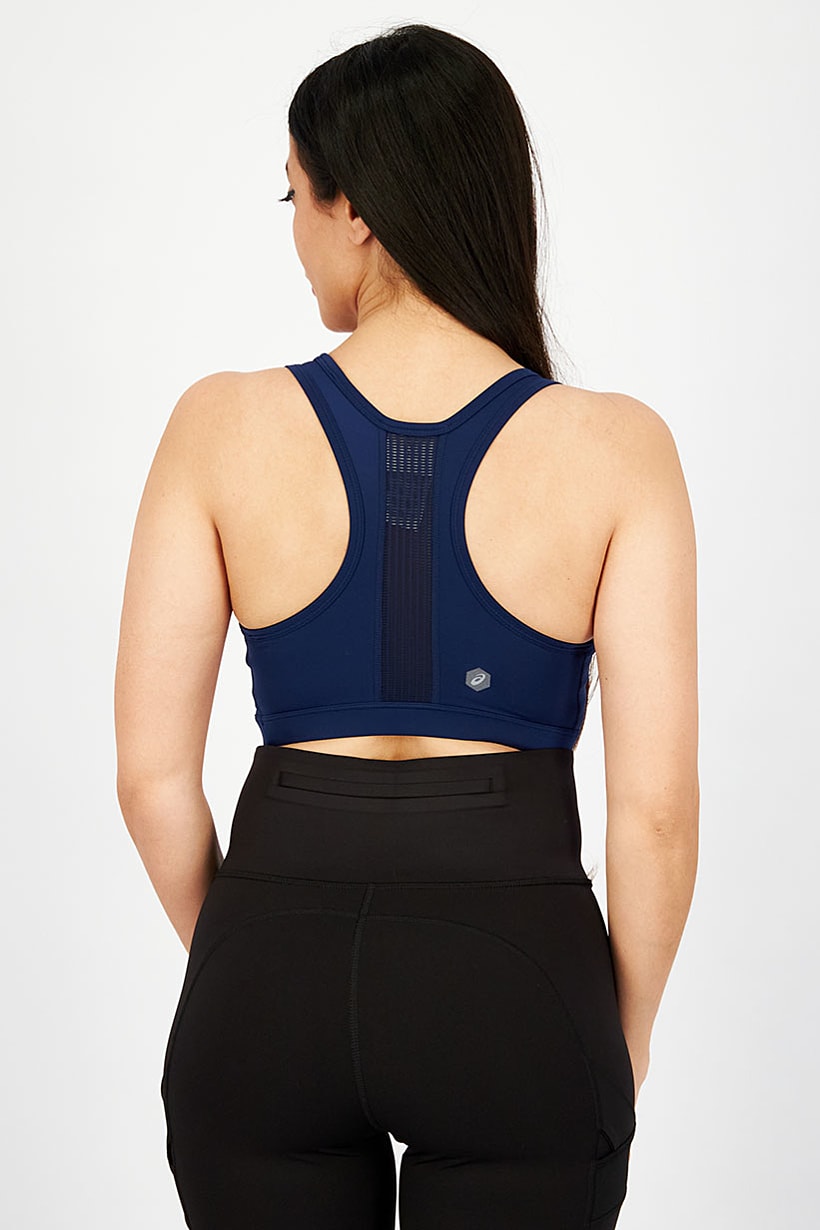 This sports bra is designed for running and has an athletic fit. It is made of 89% polyester and is machine washable. The fabric is light and the color is blue with a plain/solid pattern. Please note that due to hygiene reasons, we do not accept returns on lingerie, socks, undergarments, and swimwear. The size shown is in US sizing.