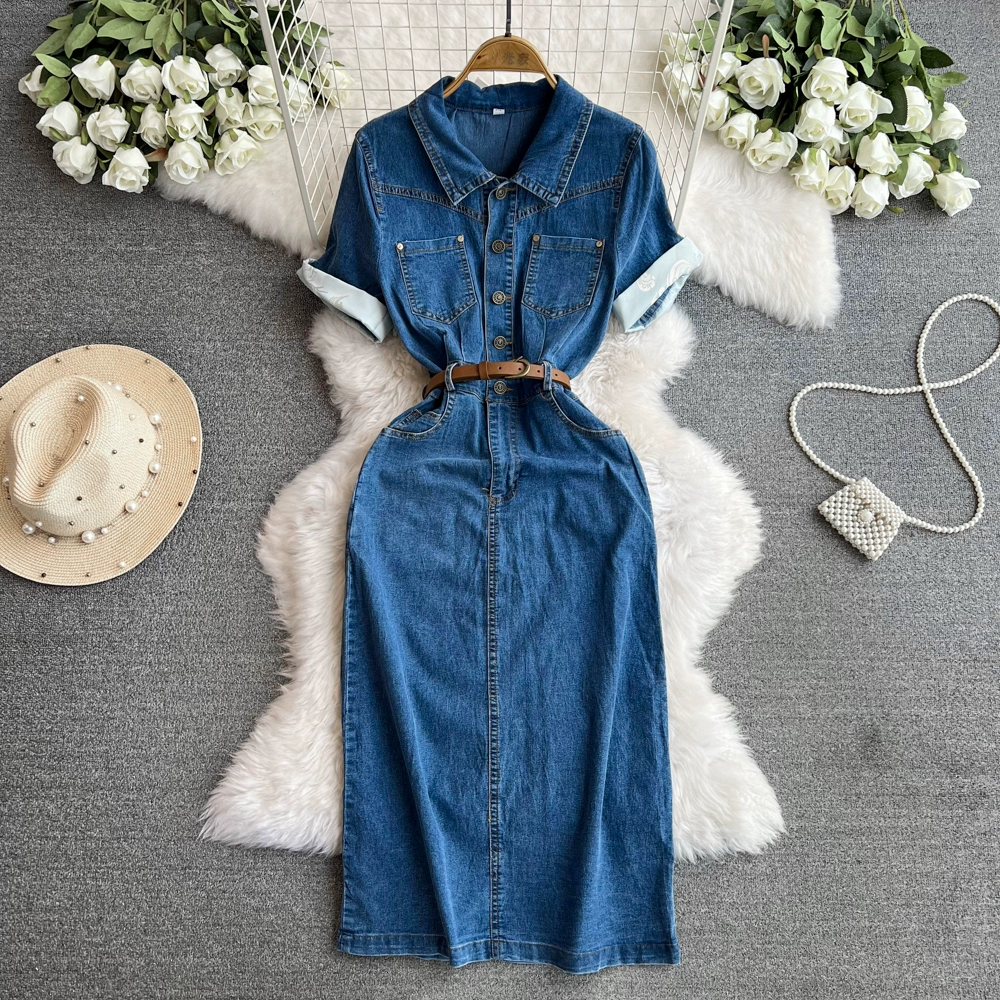 Blue retro national style short-sleeved denim dress for women 2024 summer new high-end waist mid-length skirt