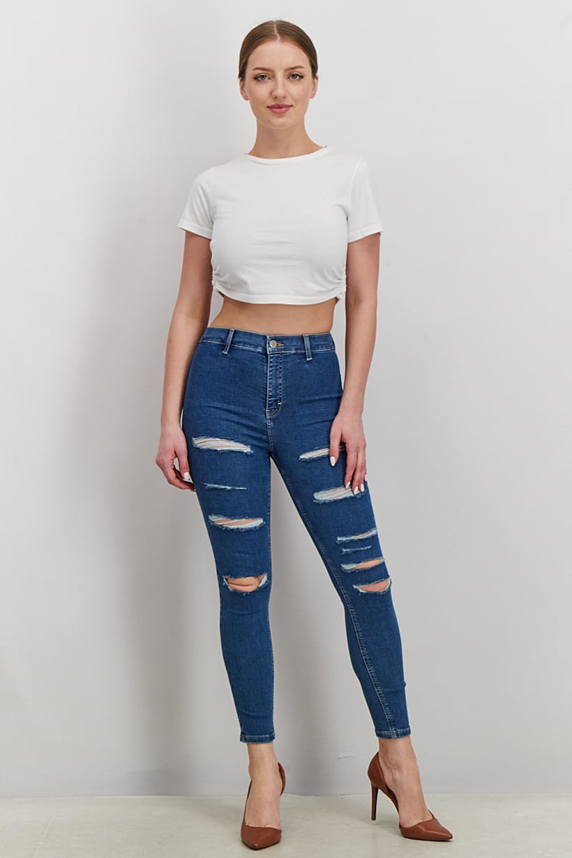 | descriptionOriginal | Bottom Hem : Straight, Care : Machine washable, Fit : Skinny Fit, Ideal For : Women, Leg Style : Skinny, Size shown : Inches, Stretch Type : Stretchable, Bottom Closure : Button, Zipper fly, Bottom Style/Pattern : Two back pockets, Fabrics : 71% Cotton, 26% Polyester, 3% Elastane, Occasion : Casual, Pattern & Print : Rip, Color Family : Blue, |
