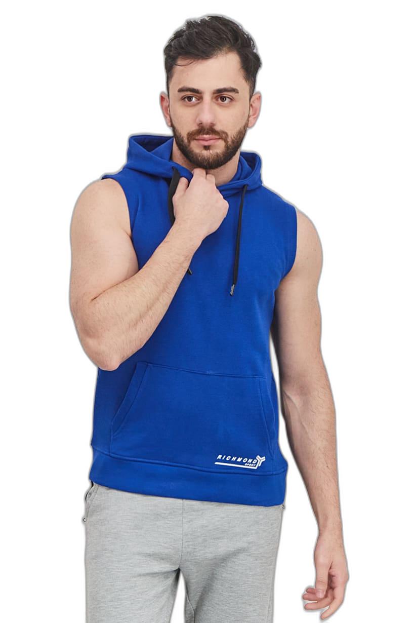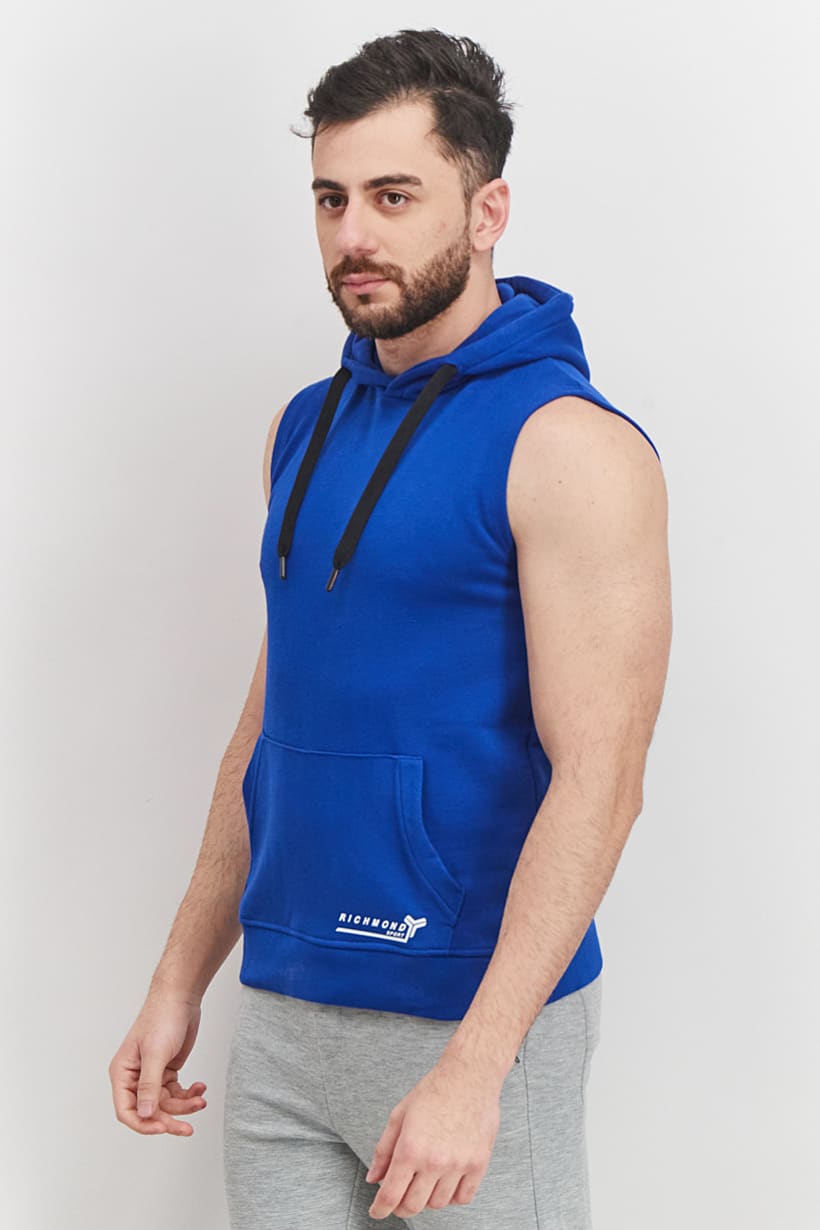 Blue Sleeveless Sweatshirt with Brand Logo and Hood with Drawstring for Men.