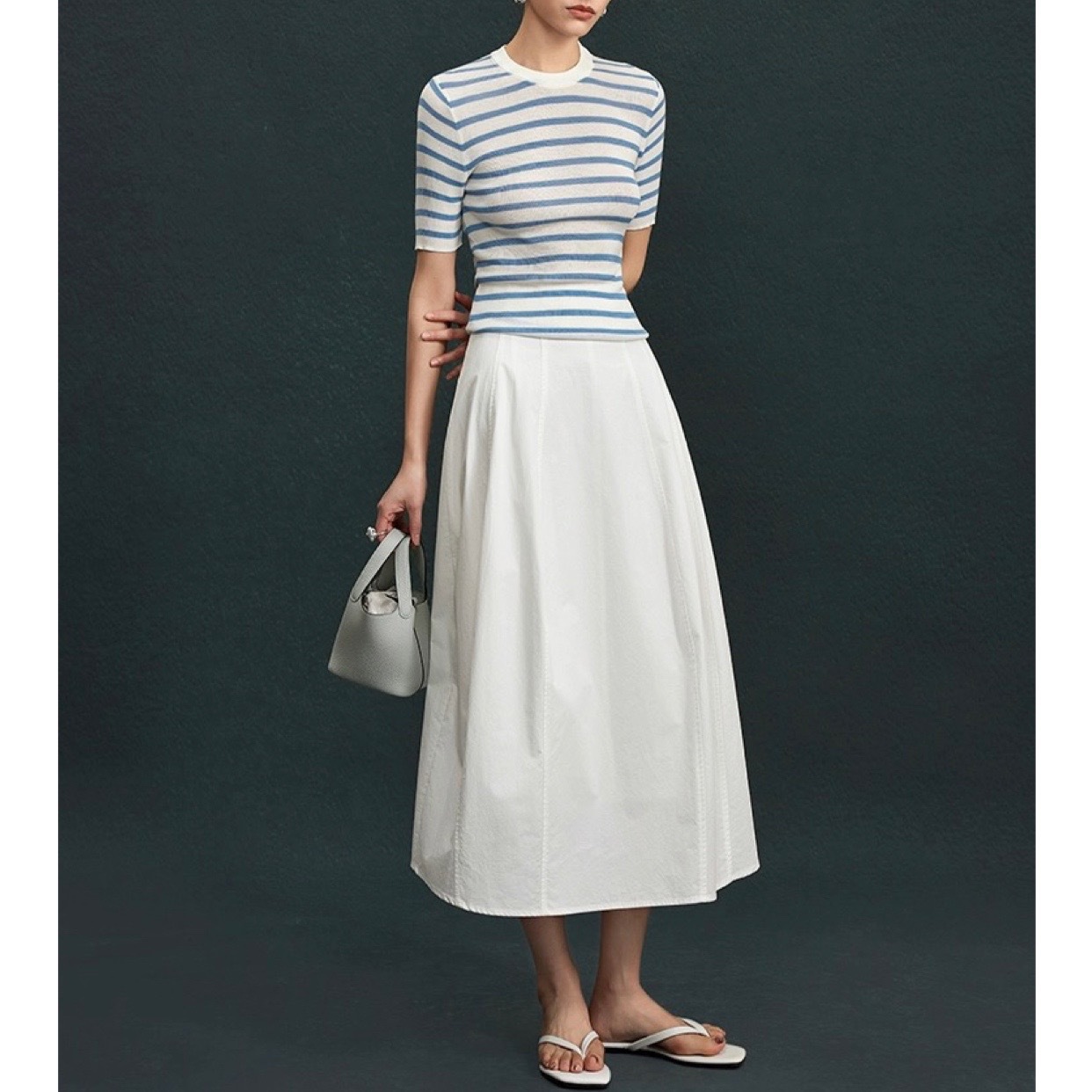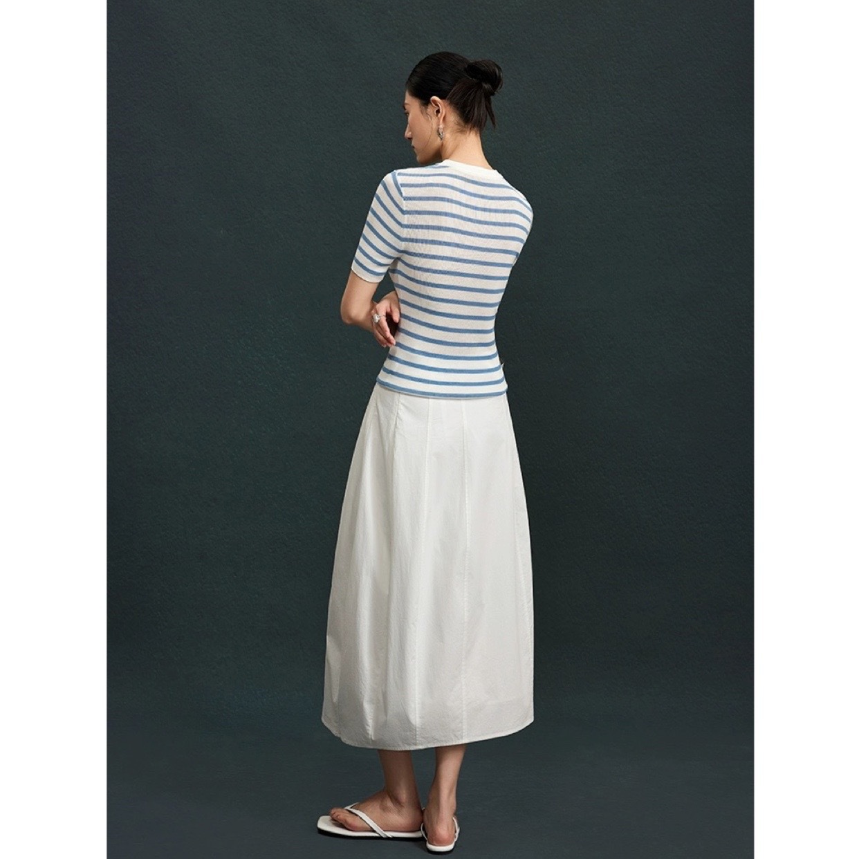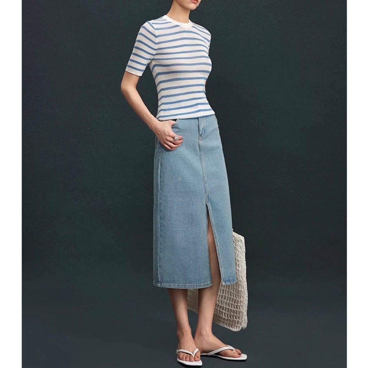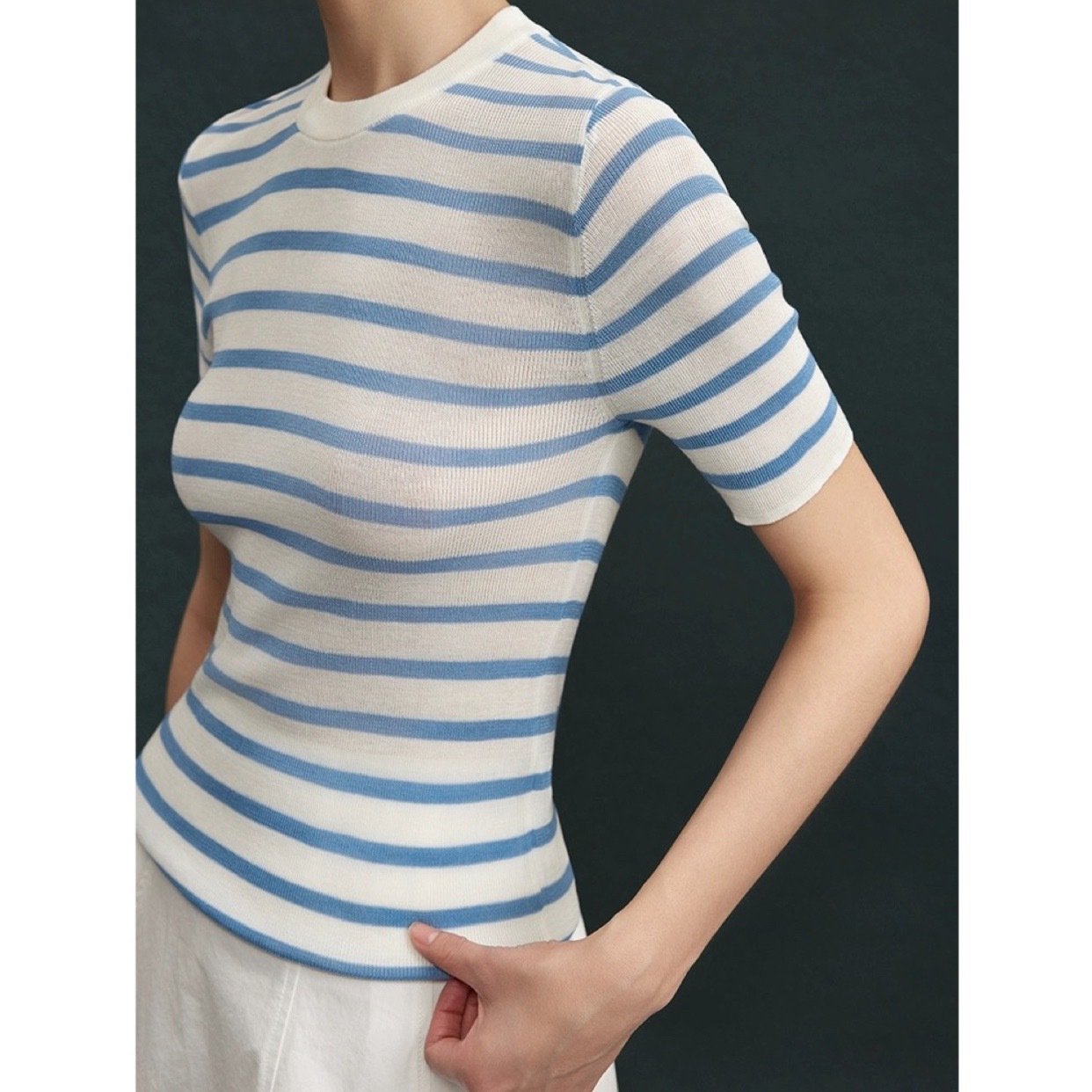 Blue Striped Shoulder Ice Silk Knitted Short-sleeved T-shirt Women’s Summer Slim-fit All-match Chic Beautiful Thin Tops